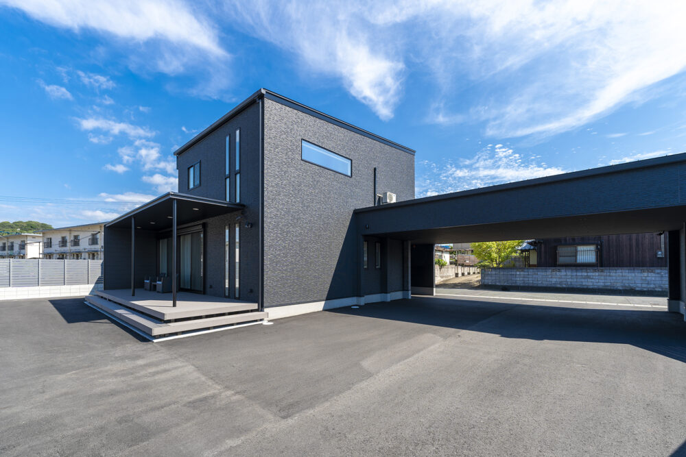 広々としたリビングは、白を基調としてダークグレーでしめるシックなモダンスタイルに。幅広の掃き出し窓が、ウッドデッキまでフラットにつながります。天井高まで高さのあるフルハイトドアは、空間をより広く演出してくれます。広々とした空間に目を奪われがちですが、収納力もまた、こだわりのポイントです。エントランスには、ウォークスルー型のシューズクローク。大容量のリビング収納に、家族の衣類を全て収納できるファミリークローゼットを備えています。