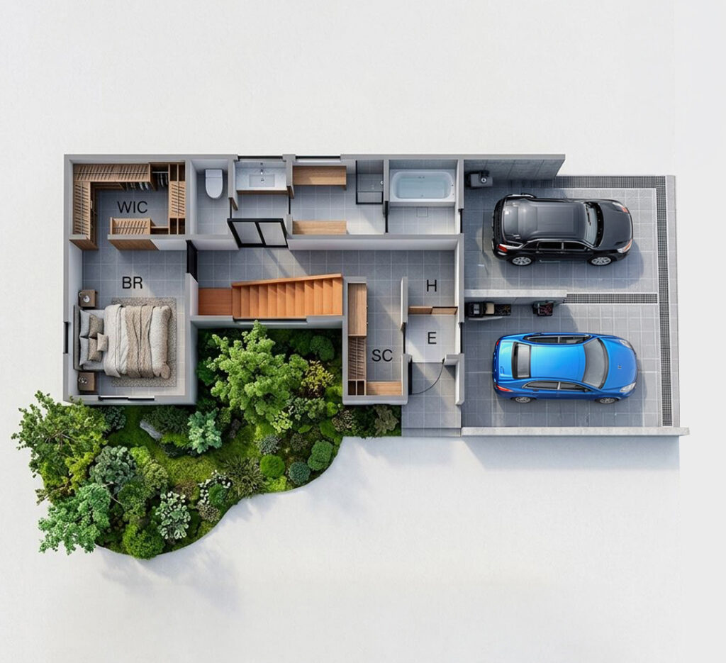 限られた敷地条件の中でも2台分の駐車を可能にし、機能性と利便性を両立しています。