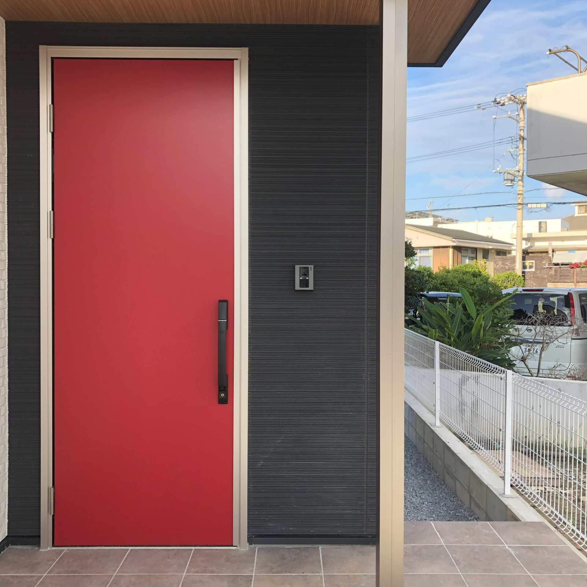 フラットタイルテラスのアウトドアリビングの家