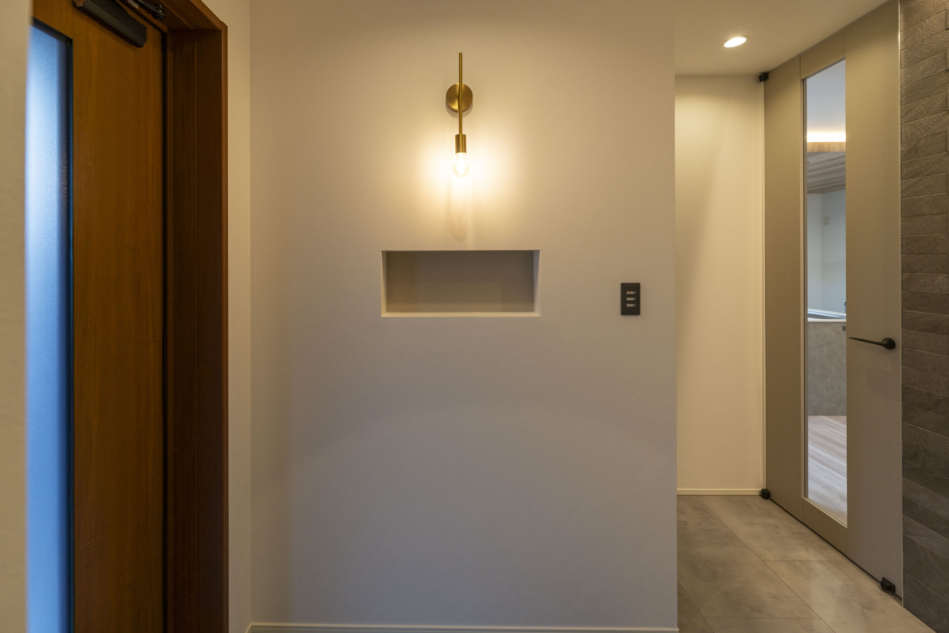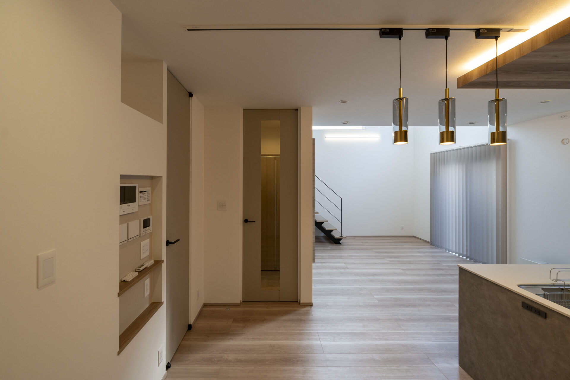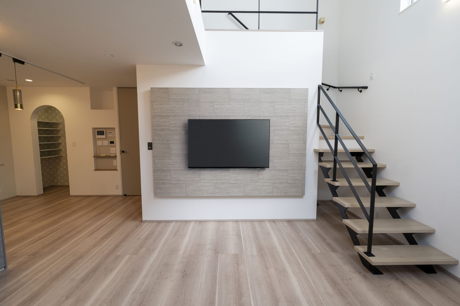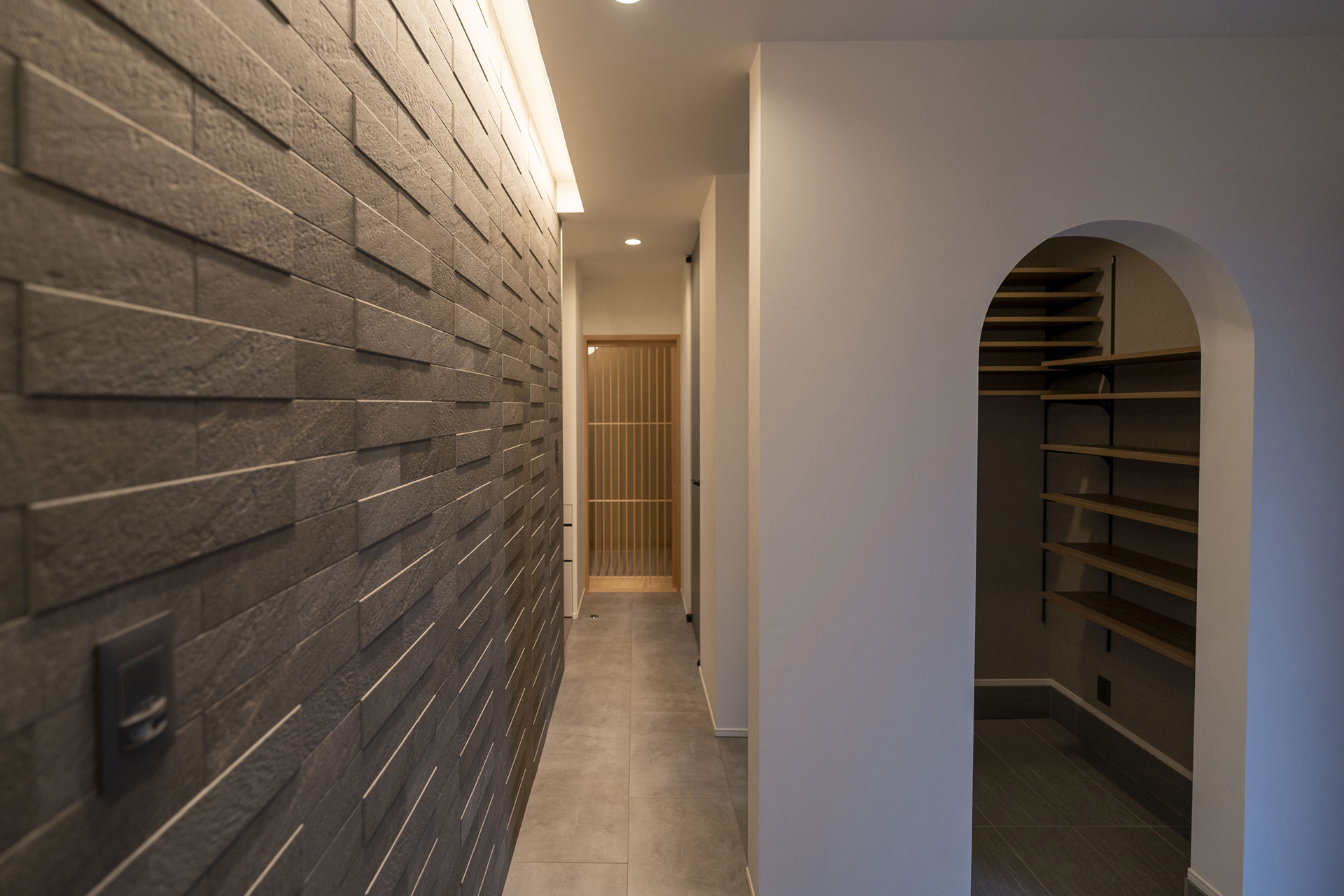 光と素材が響き合う吹抜けリビングの住まい吹抜けのLDKは、大きな窓から自然光がたっぷりと入り、時間帯によって表情を変える明るさが心地よい空間です。上下階をつなぐ開放的な抜け感が、ご家族の気配をやさしくつなぎます。また、玄関ホールの一角には外壁材を室内に取り入れ、素材感のあるアクセントウォールを設けました。屋外で使われる堅牢な質感が内部空間に独特の存在感をもたらし、上質さと落ち着きを演出します。光と素材が織りなす、伸びやかな住まいになりました。