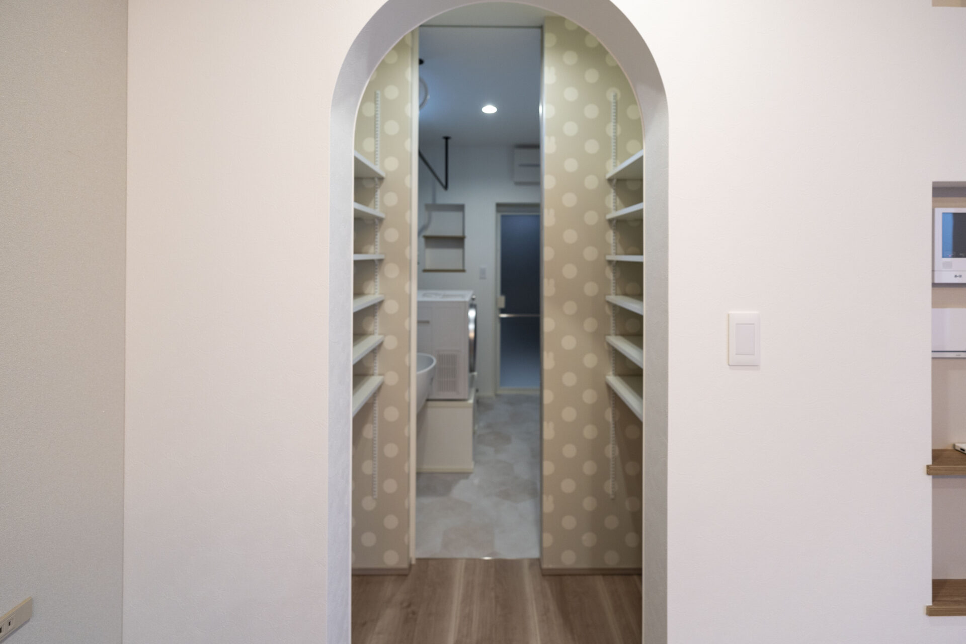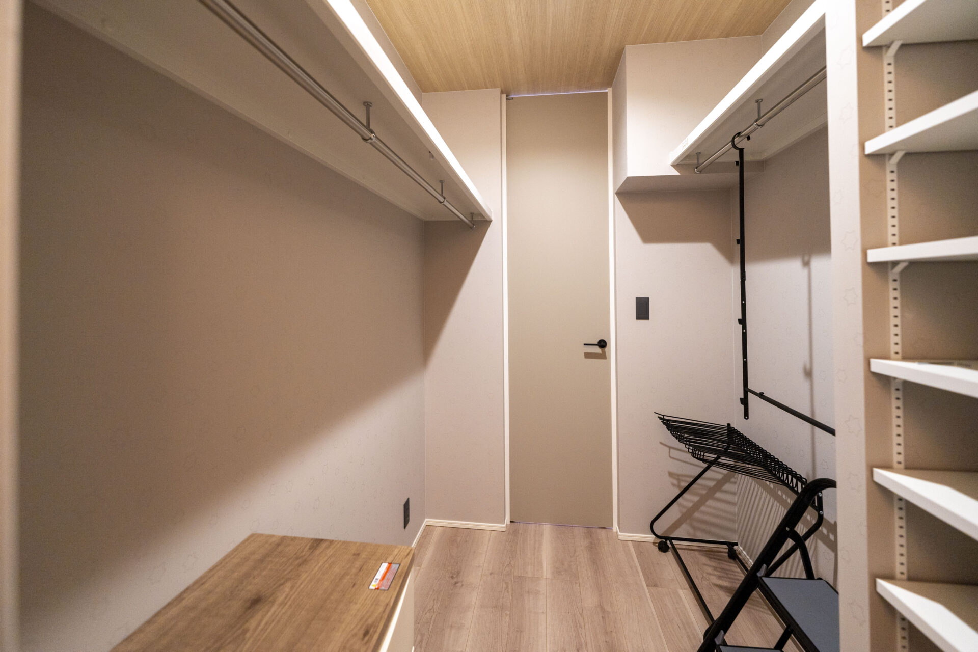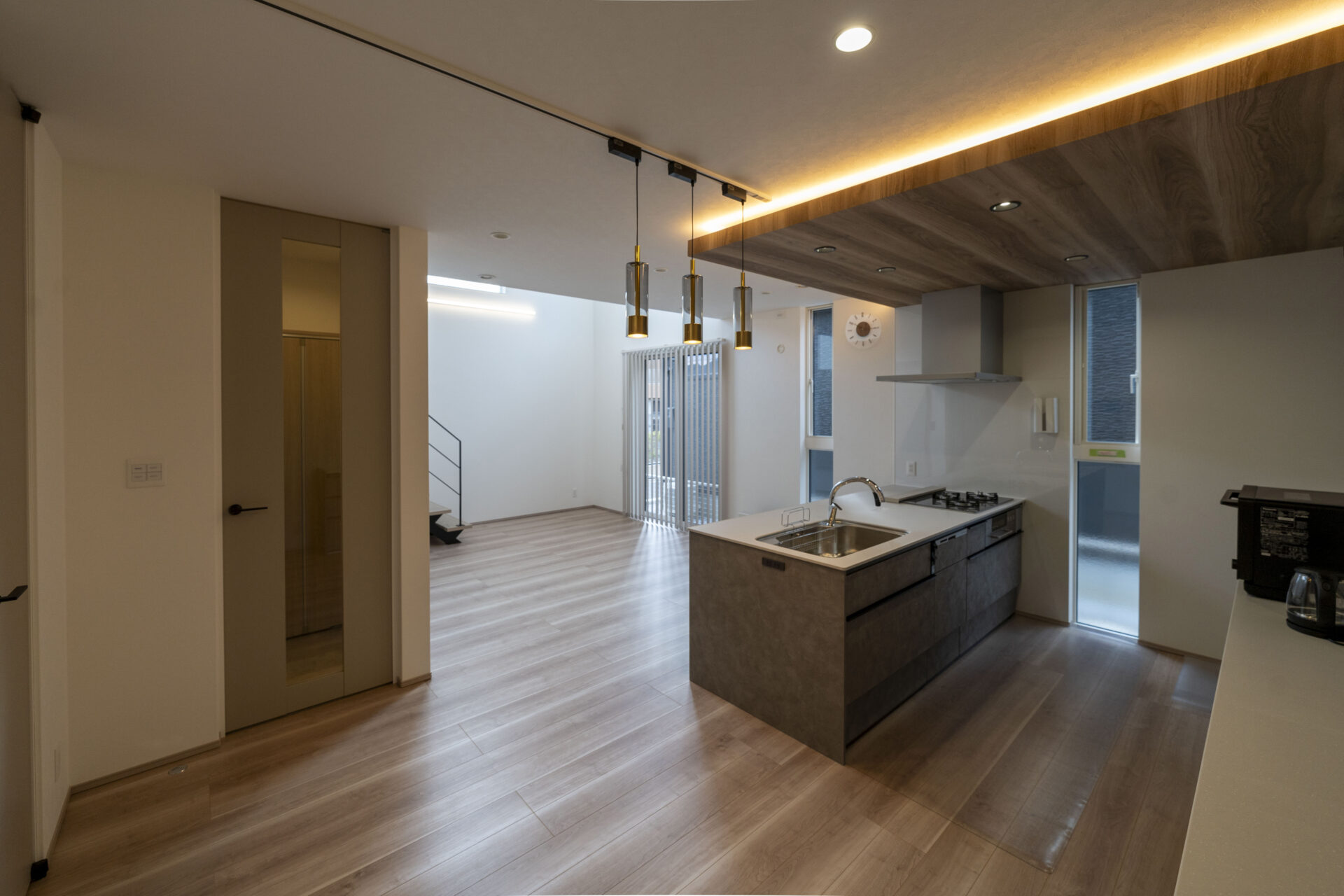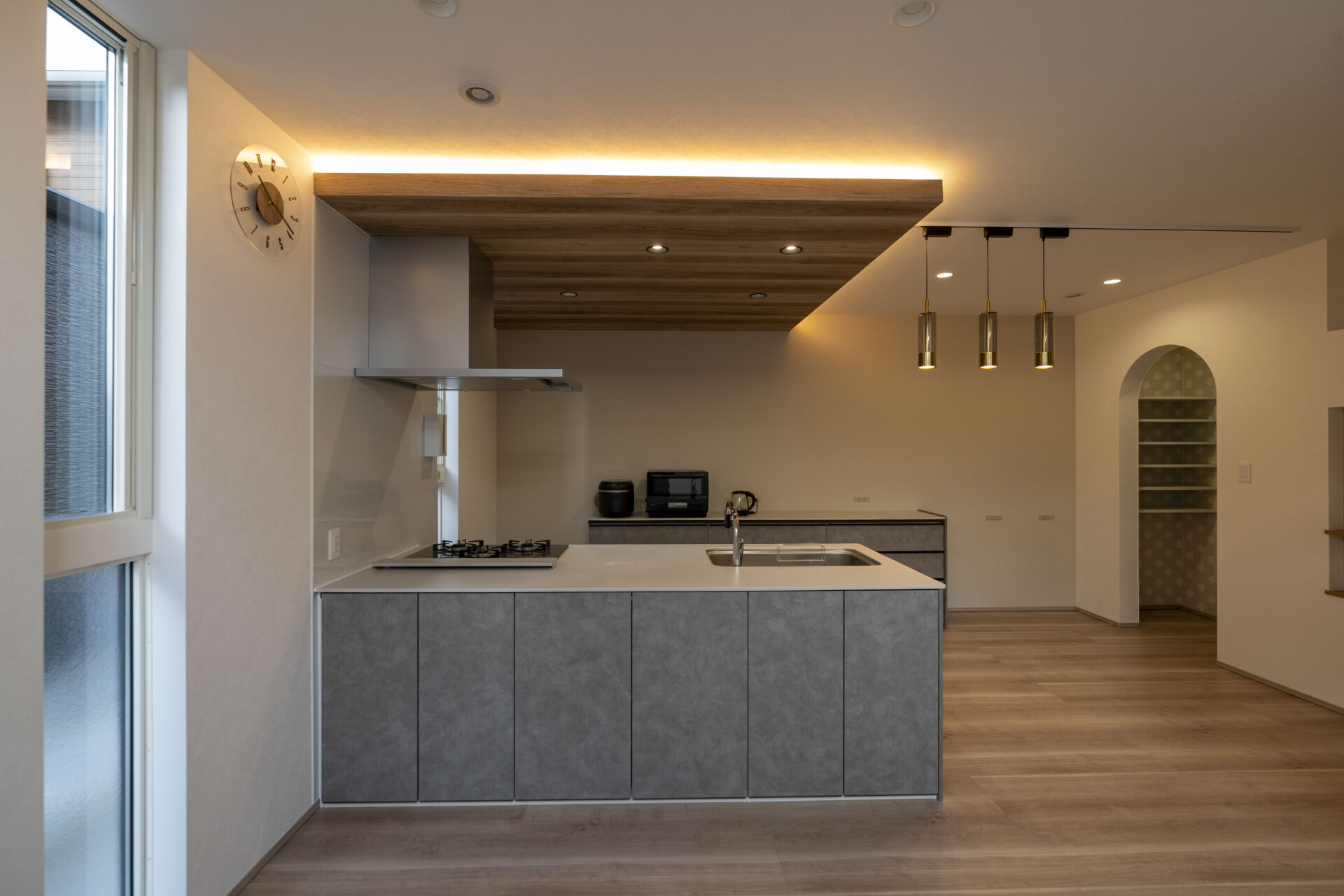 光と素材が響き合う吹抜けリビングの住まい吹抜けのLDKは、大きな窓から自然光がたっぷりと入り、時間帯によって表情を変える明るさが心地よい空間です。上下階をつなぐ開放的な抜け感が、ご家族の気配をやさしくつなぎます。また、玄関ホールの一角には外壁材を室内に取り入れ、素材感のあるアクセントウォールを設けました。屋外で使われる堅牢な質感が内部空間に独特の存在感をもたらし、上質さと落ち着きを演出します。光と素材が織りなす、伸びやかな住まいになりました。