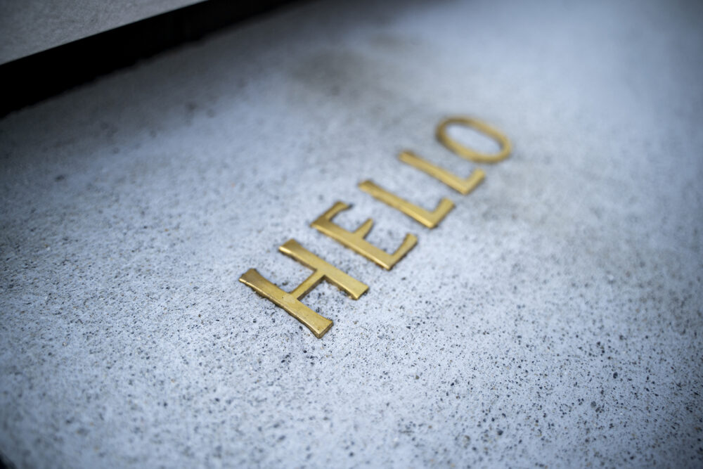HELLOの文字が出迎えてくれる玄関アプローチは、踏板を前に突き出させることで浮遊感のあるフローティングステップに。