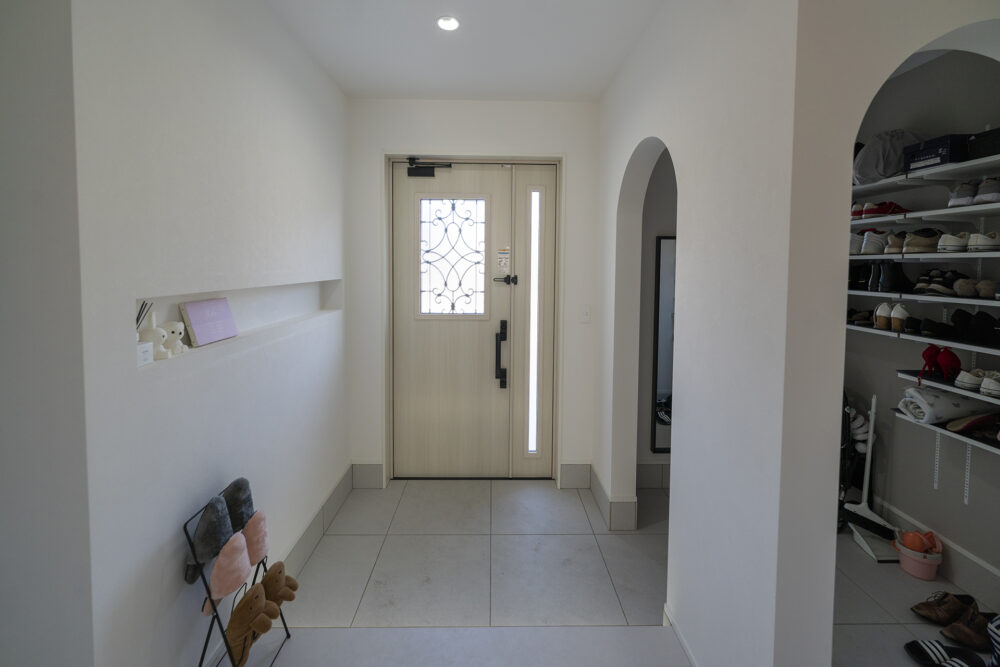随所にアーチ形状を用い、白を基調としてグレイッシュなカラーでやさしい佇まいの1邸となりました。