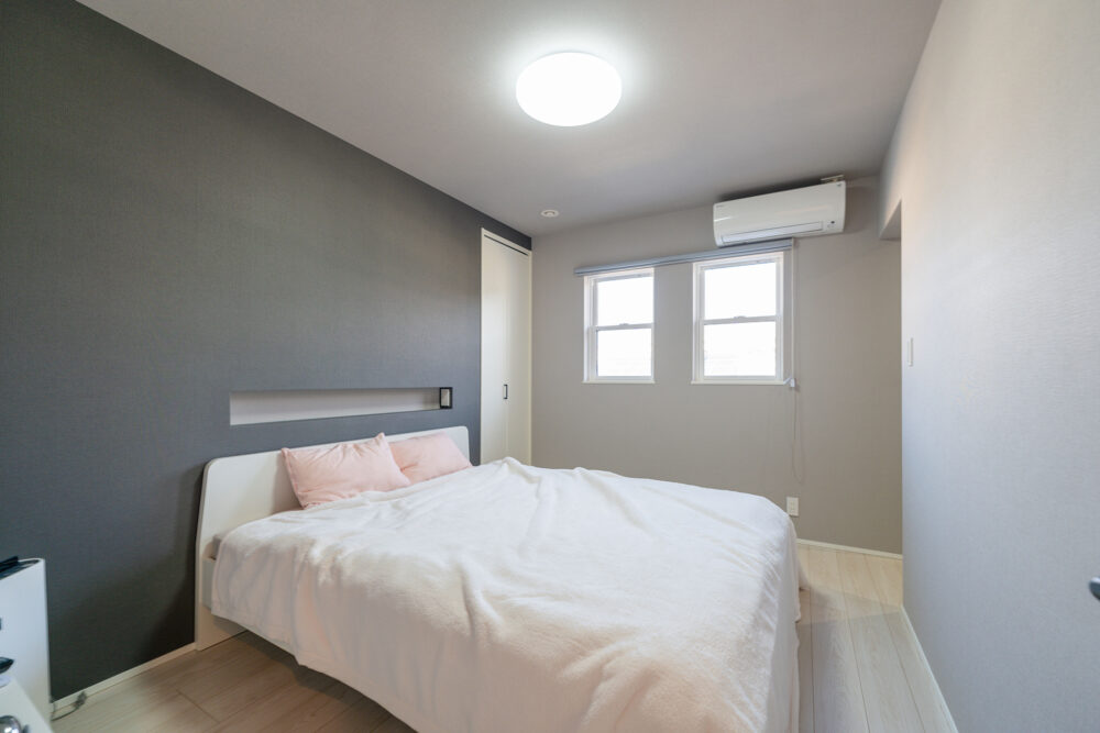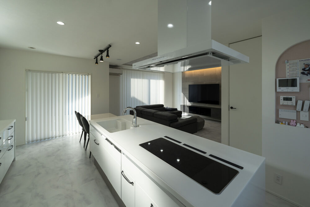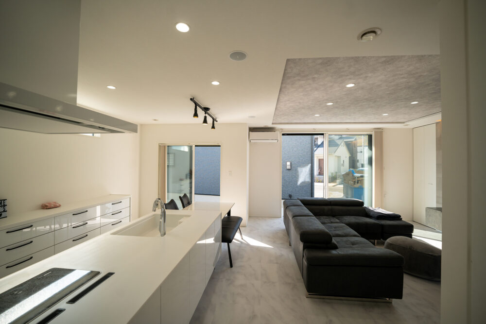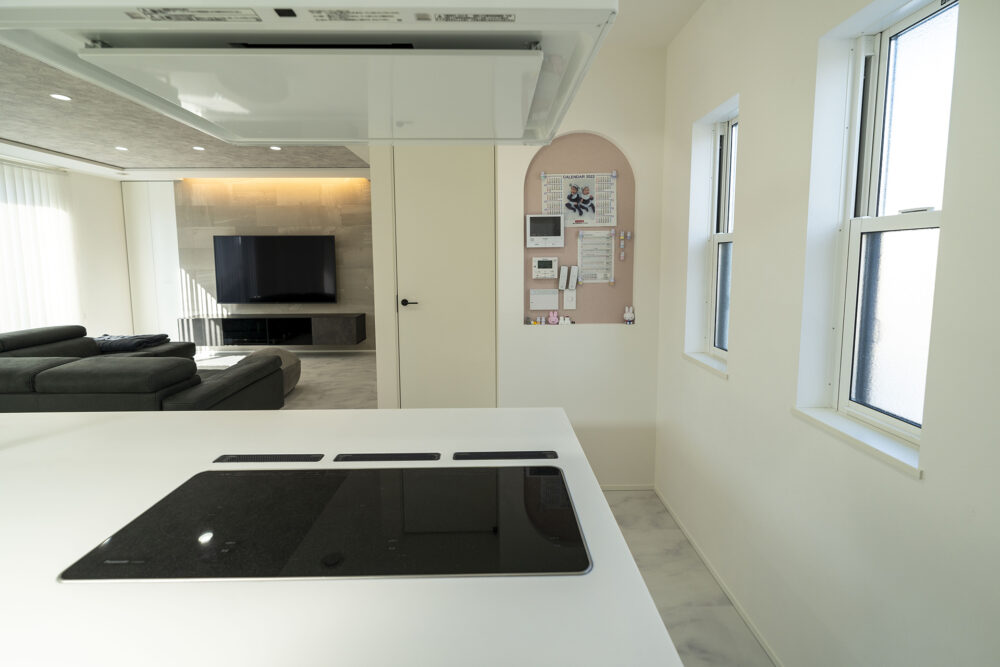 明るい光が注ぐ南側のLDKは白のフロアタイルにすることで、より一層空間全体を眩くつつみます。アクセントウォール、折り上げ天井は、落ち着いたグレイッシュな色見で空間全体をやさしく引き締めます。