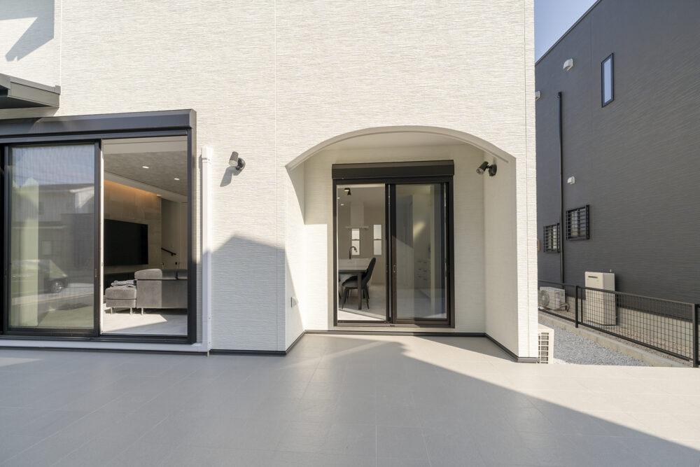 LDKを一歩外に出ると、アウトドアリビングとして活躍できる広々としたタイルテラス。屋外のアーチの開口部が、ヨーロピアンな雰囲気を演出してくれます。