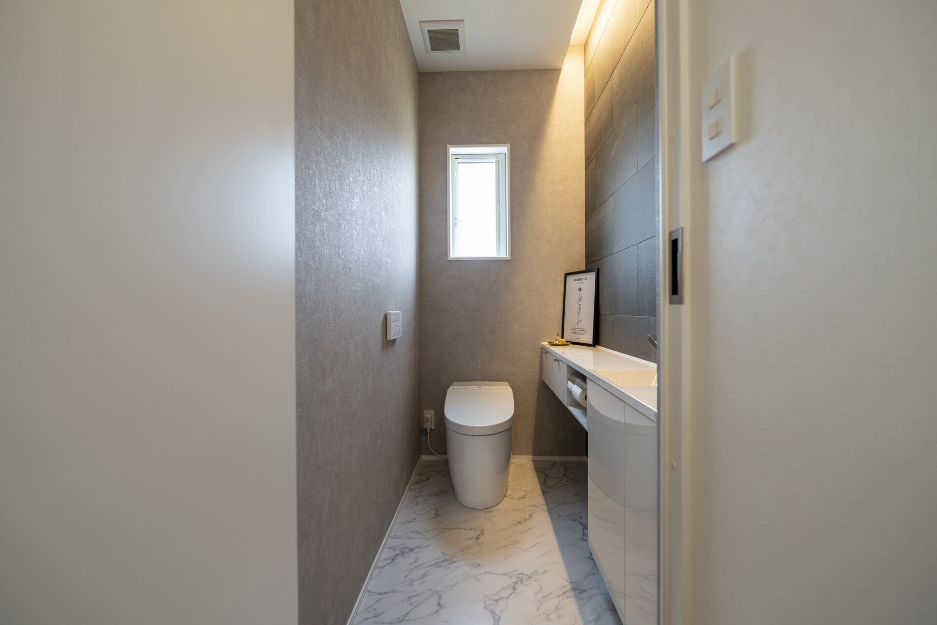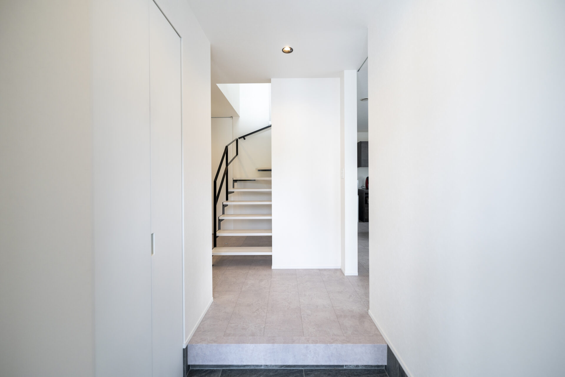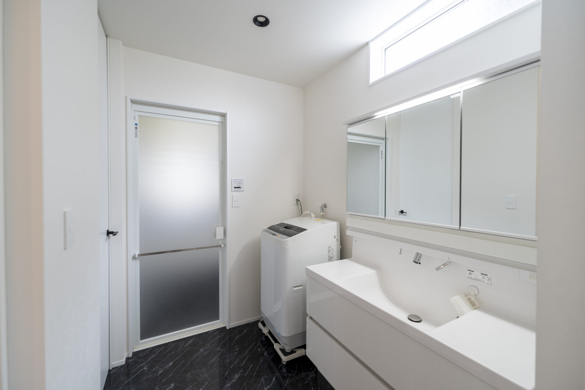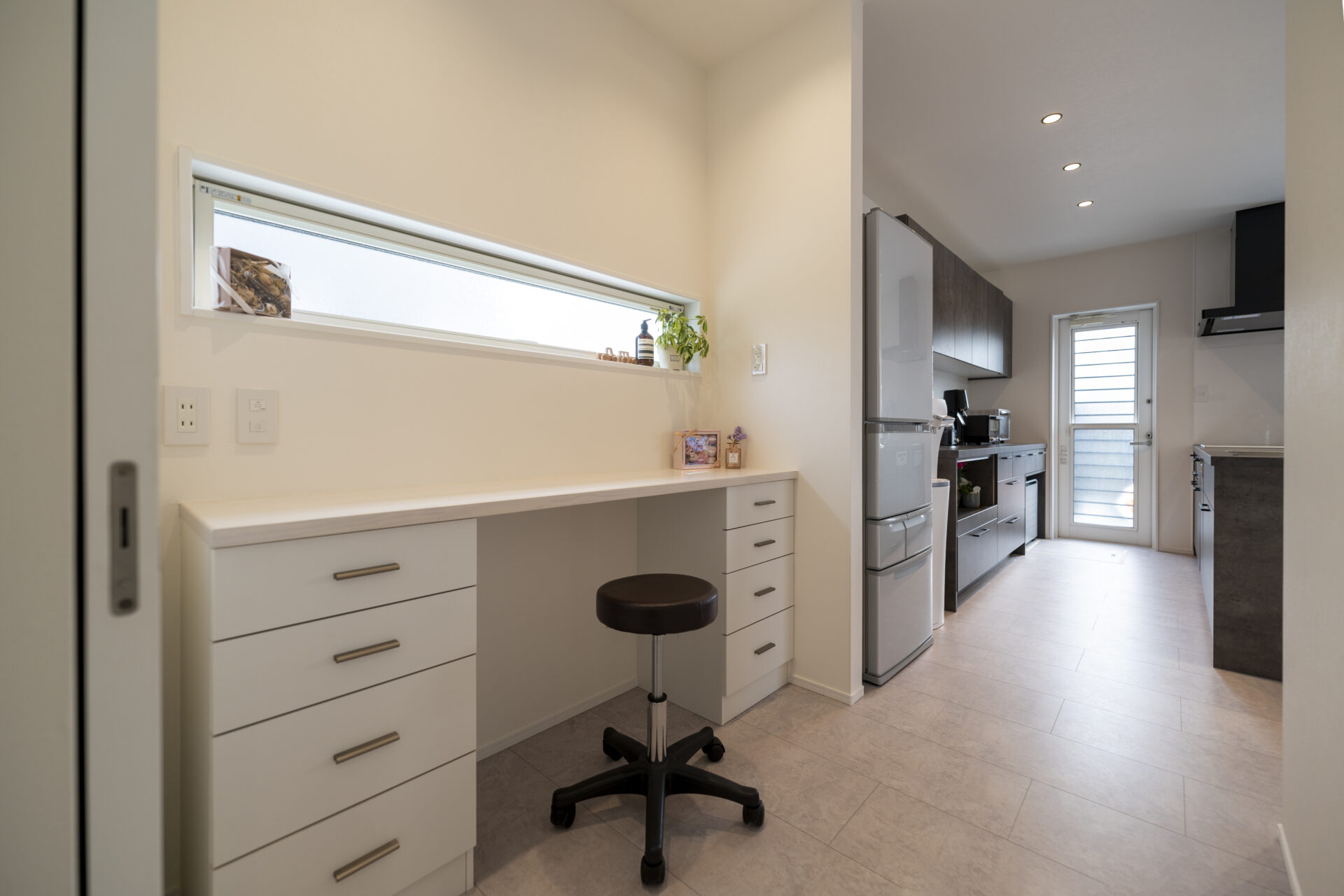 キッチン→家事室→バスルーム家事導線をシンプルに。お掃除ロボットが全フロア行き来しやすいフラットな建具もワンちゃんがいるご家族には、嬉しいポイントです。