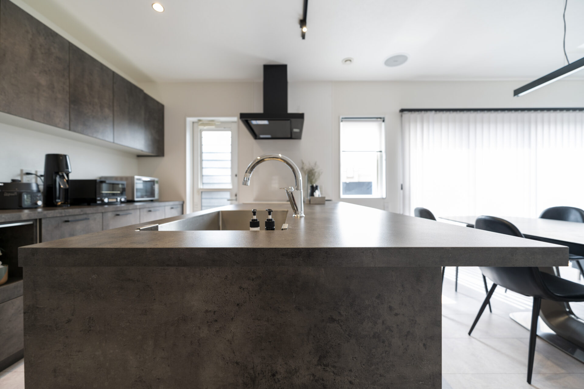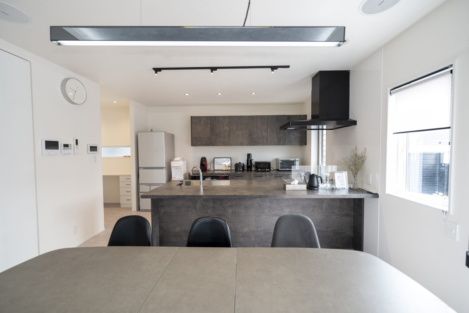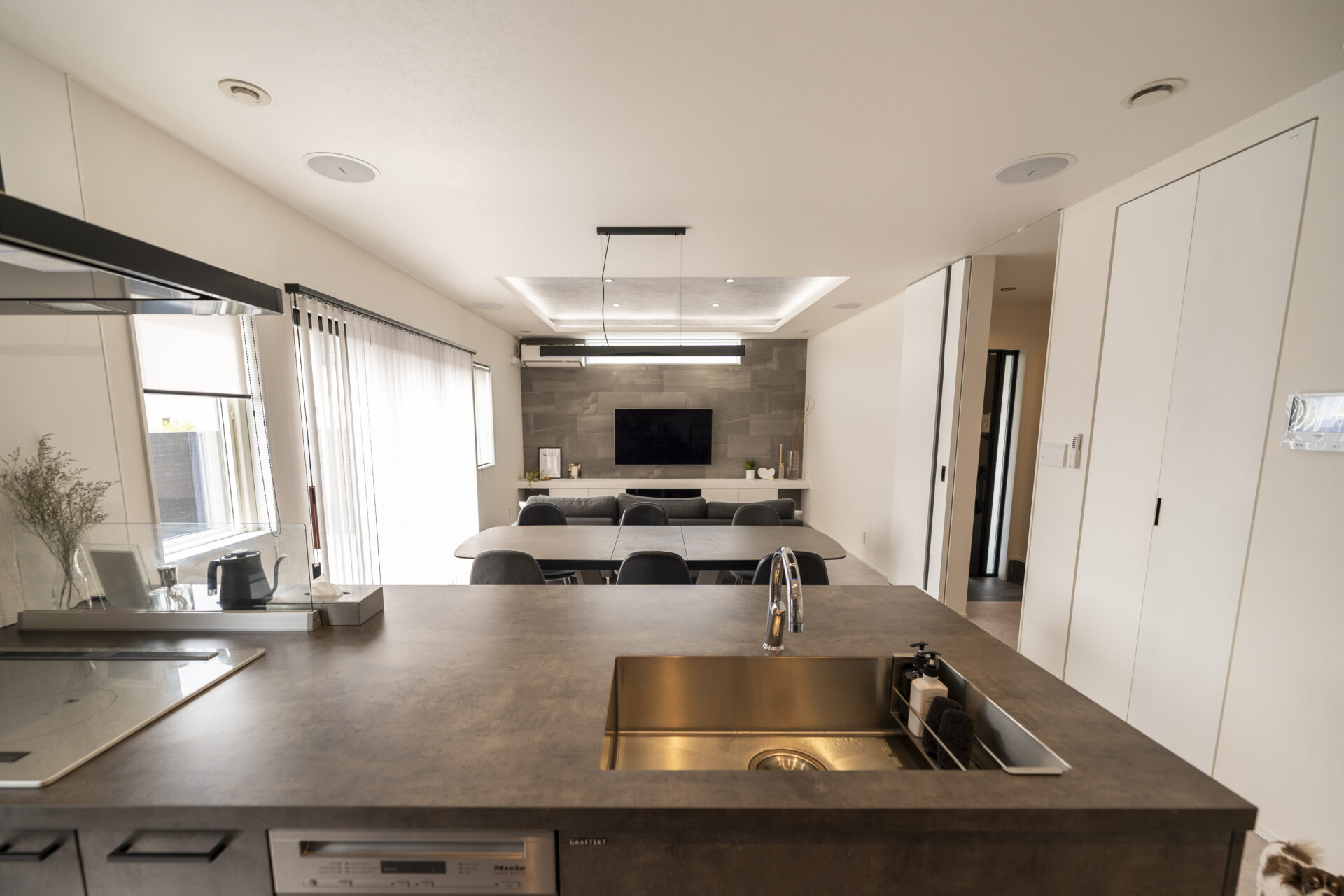 キッチンは、カウンターとしても機能する天板の広いGRAFTEKT(グラフテクト)。キッチンと同じマテリアルのカップボード、ダイニングテーブルで、統一感を出しスタイリッシュな印象に仕上げました。ダイニングの天井部分には、BOSEの天井埋め込み型スピーカーを設置。洗い物をしながらでも、テレビの音がちゃんと聞こえると奥様に好評いただいています。