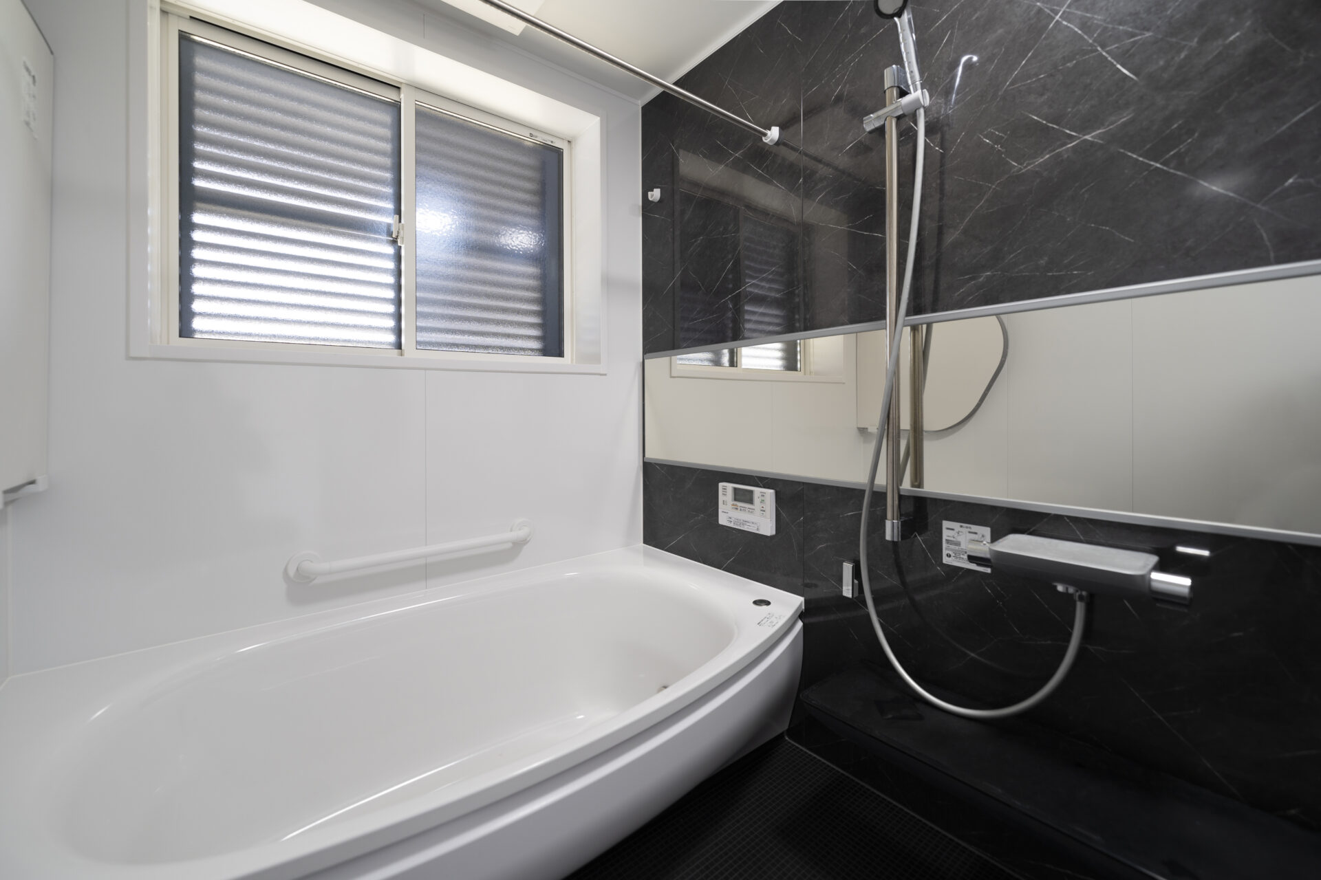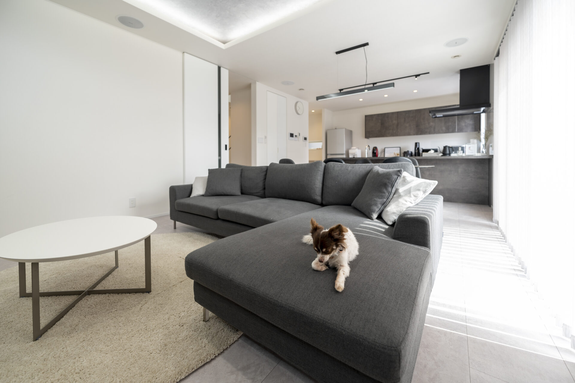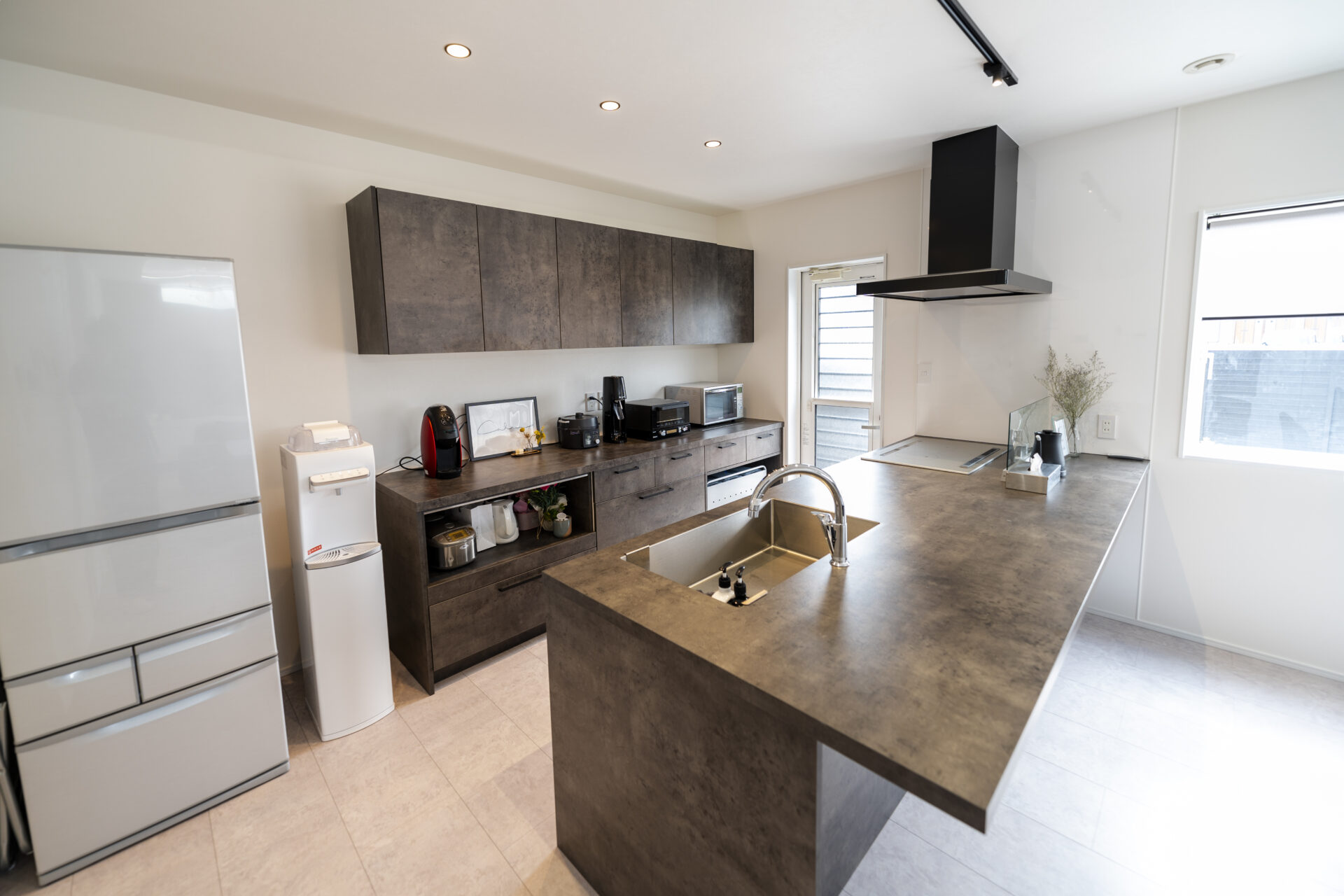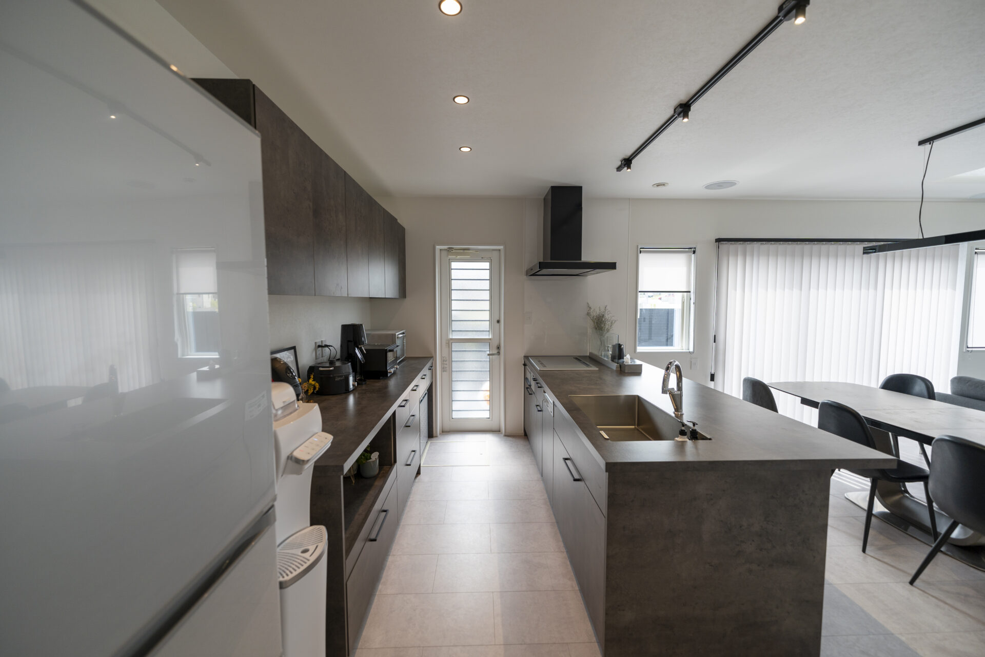 キッチンは、カウンターとしても機能する天板の広いGRAFTEKT(グラフテクト)。キッチンと同じマテリアルのカップボード、ダイニングテーブルで、統一感を出しスタイリッシュな印象に仕上げました。ダイニングの天井部分には、BOSEの天井埋め込み型スピーカーを設置。洗い物をしながらでも、テレビの音がちゃんと聞こえると奥様に好評いただいています。