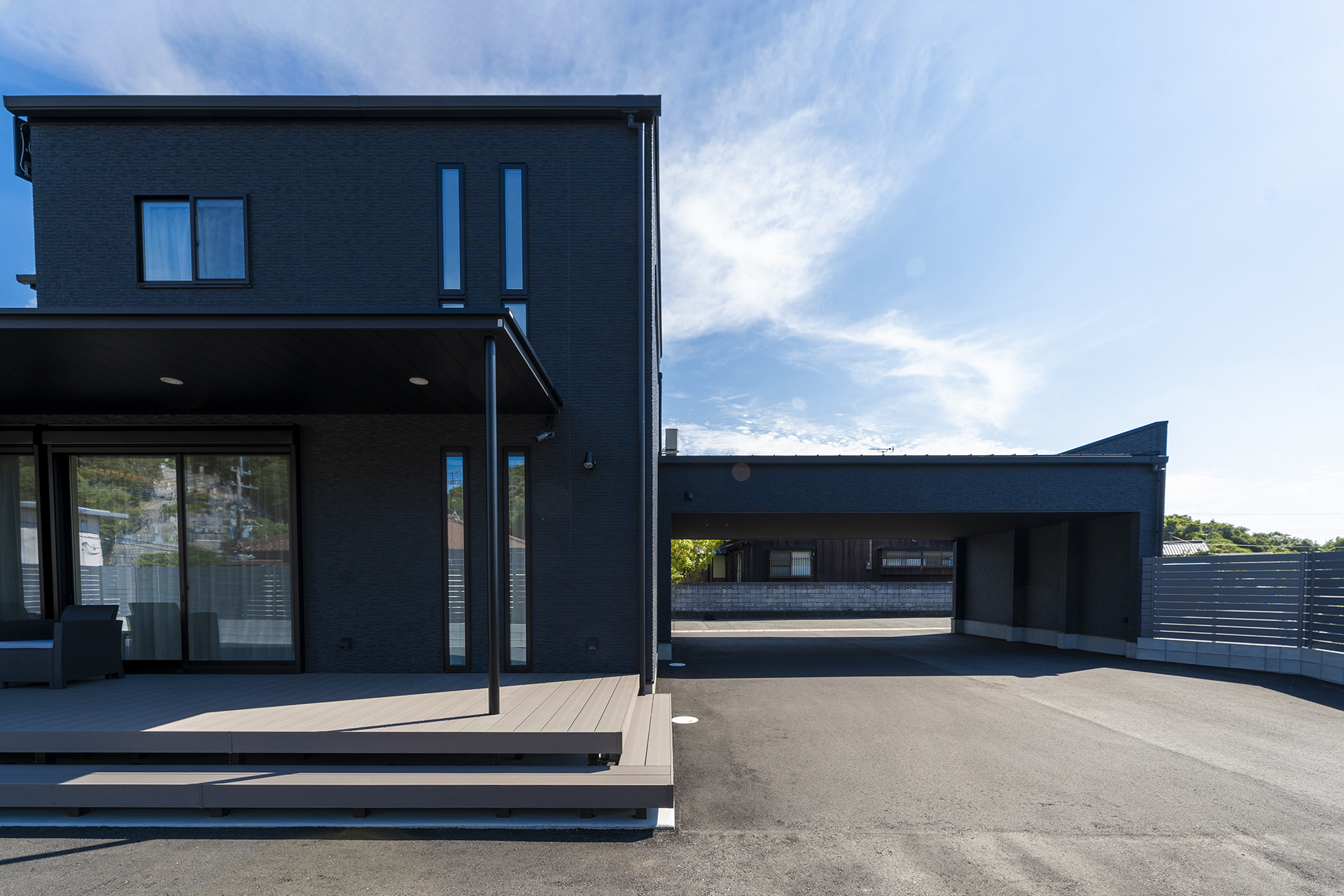 外観の写真をカメラに収めるのに一苦労するくらい大パノラマのガレージスペースは一見の価値があります。建物の裏手には、広々としたウッドデッキを完備。隣家より小高い立地なので、ウッドデッキからは、開放感のある眺望が望めます。開放感溢れるデッキスペースはご家族で食事を楽しむ。はたまた、友だちをお誘いしてガーデンパーティを楽しむことのできるアウトドアリビングとなりました。