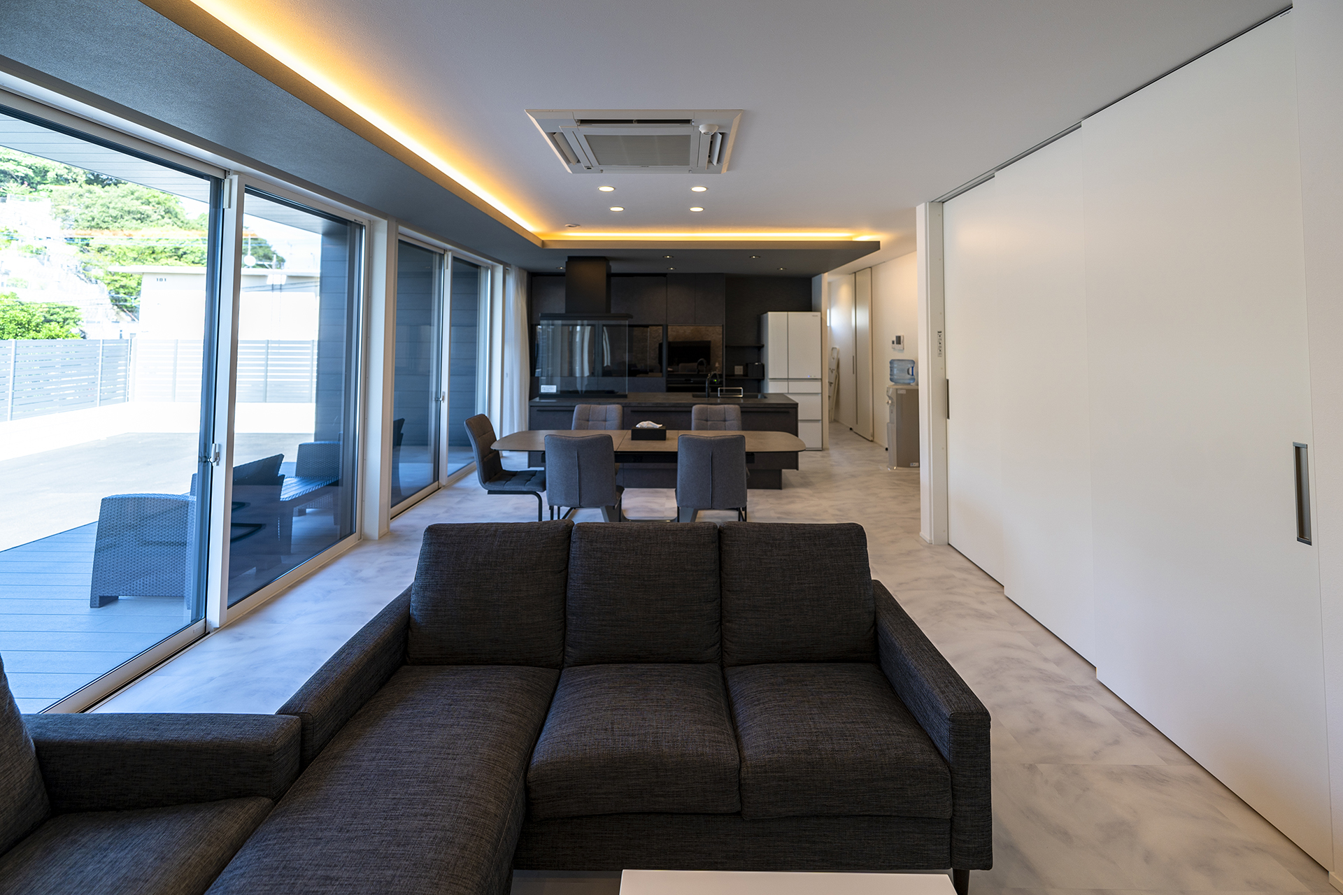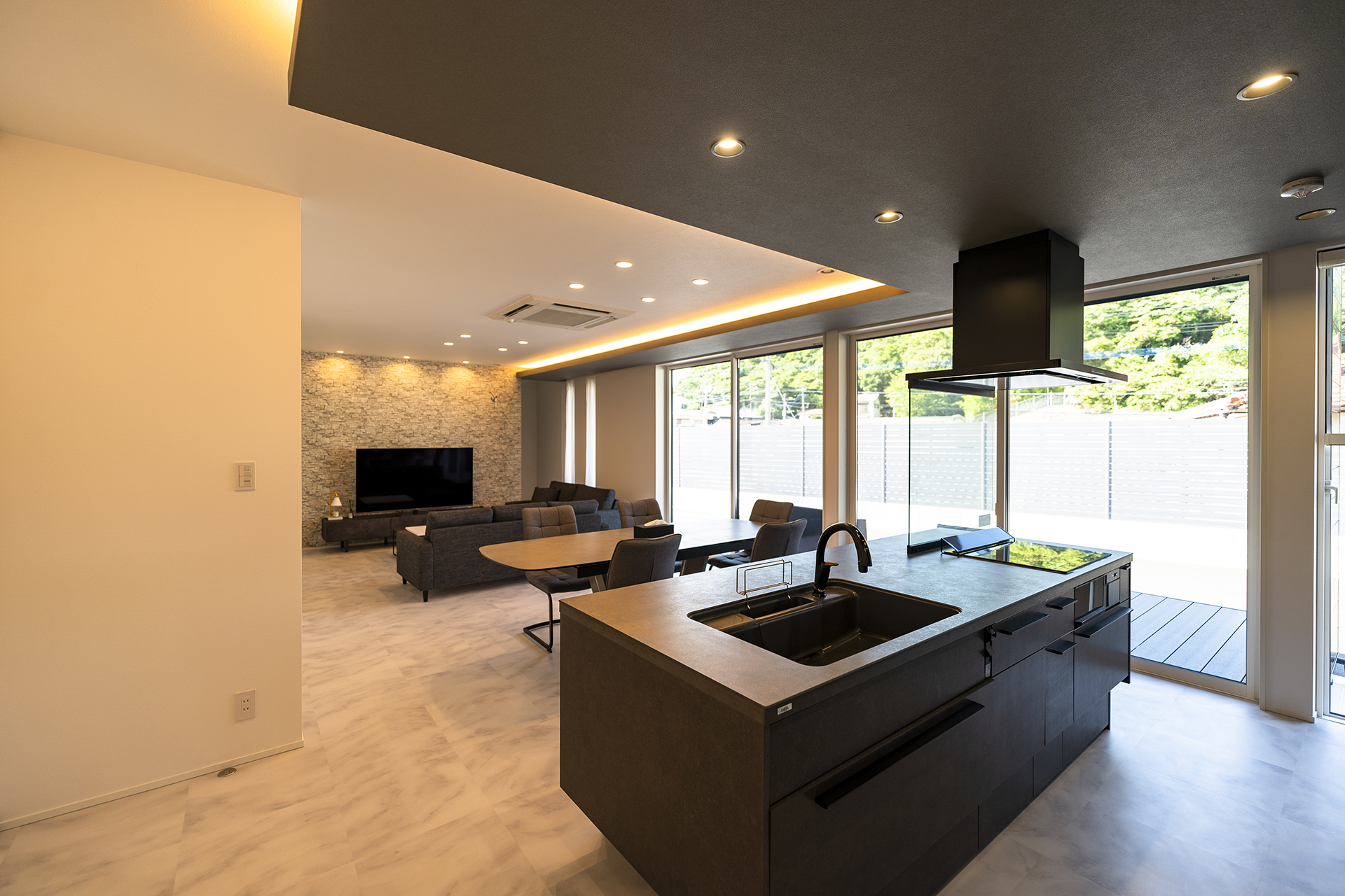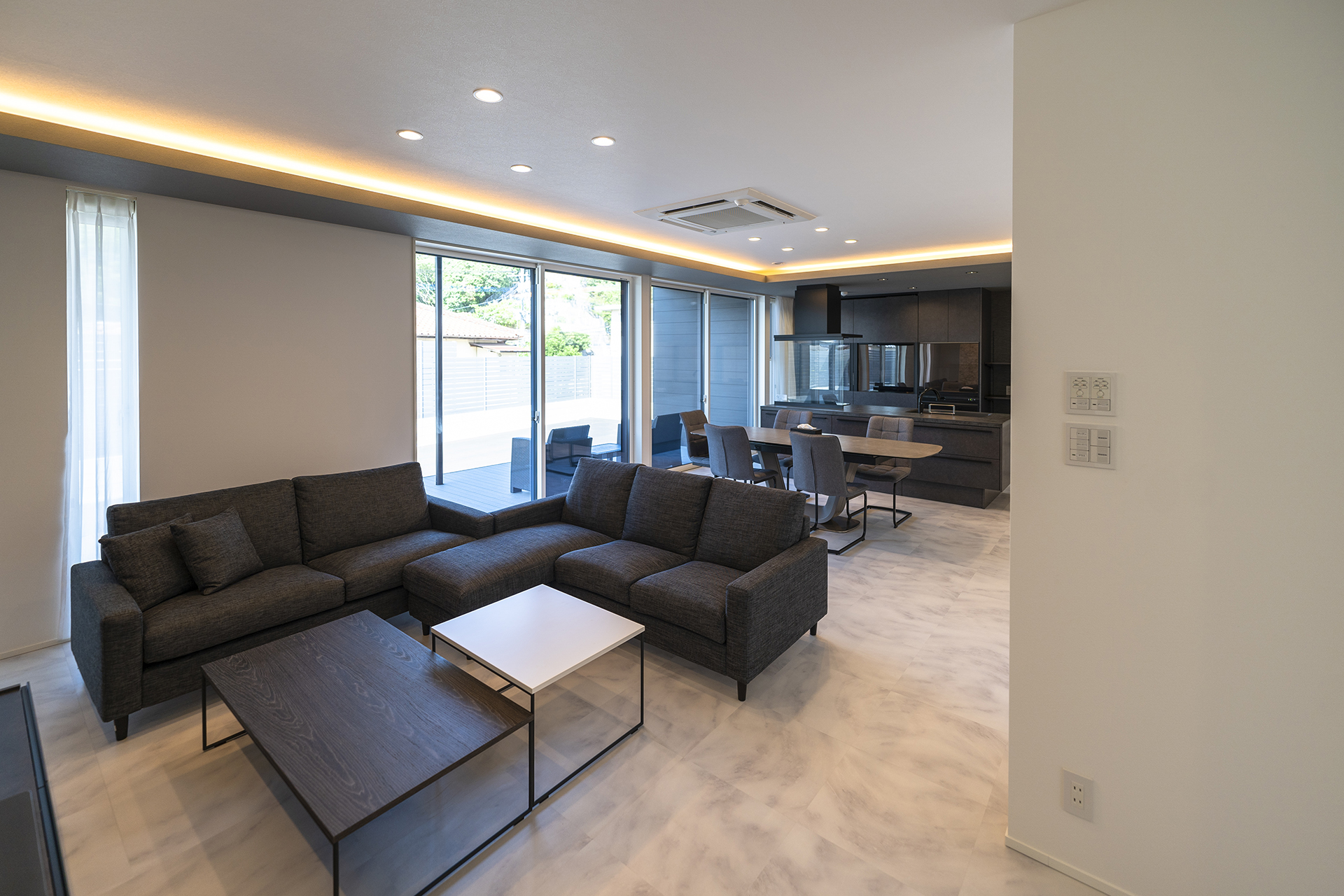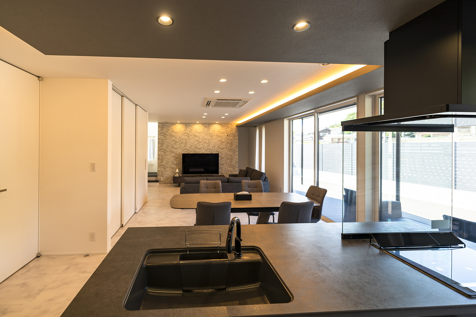 広々としたリビングは、白を基調としてダークグレーでしめるシックなモダンスタイルに。幅広の掃き出し窓が、ウッドデッキまでフラットにつながります。天井高まで高さのあるフルハイトドアは、空間をより広く演出してくれます。広々とした空間に目を奪われがちですが、収納力もまた、こだわりのポイントです。エントランスには、ウォークスルー型のシューズクローク。大容量のリビング収納に、家族の衣類を全て収納できるファミリークローゼットを備えています。