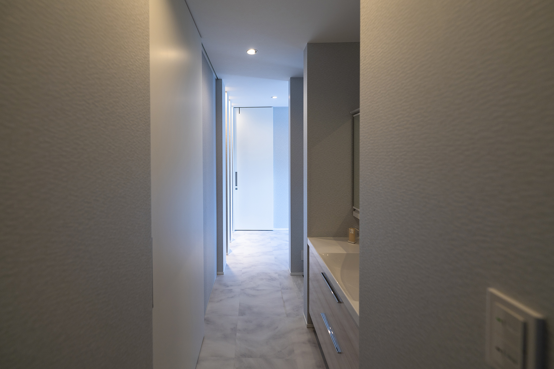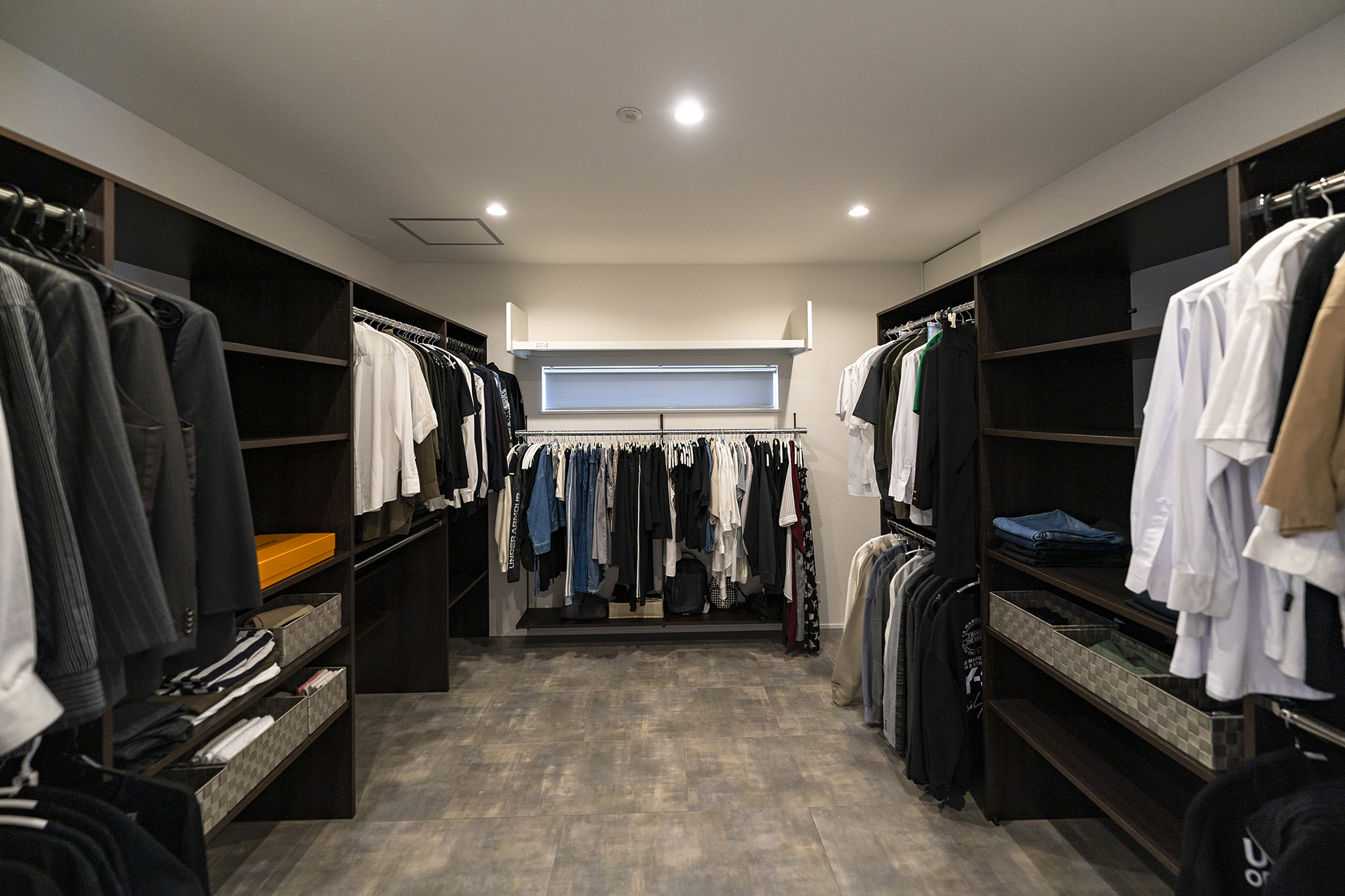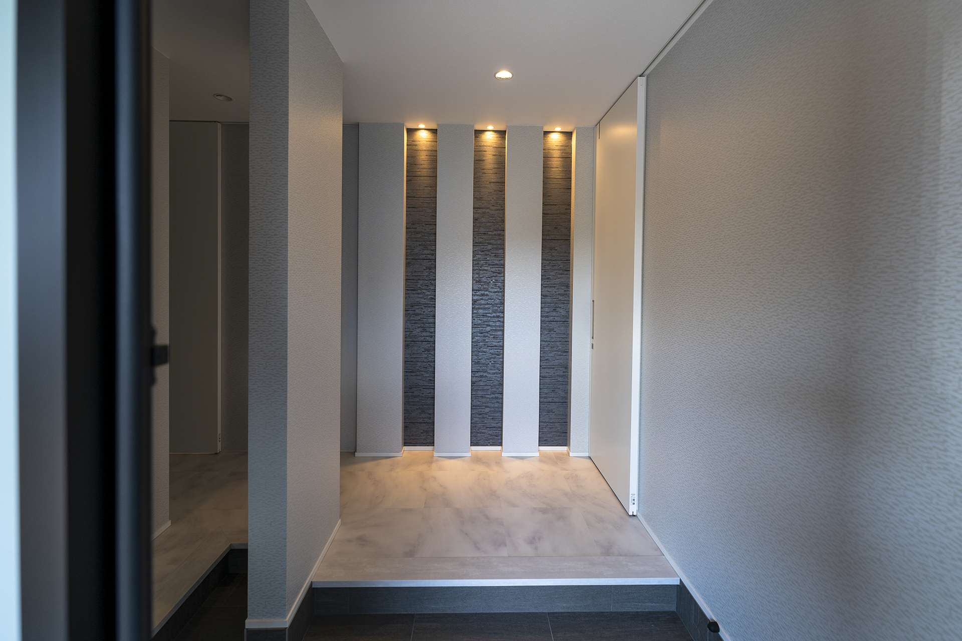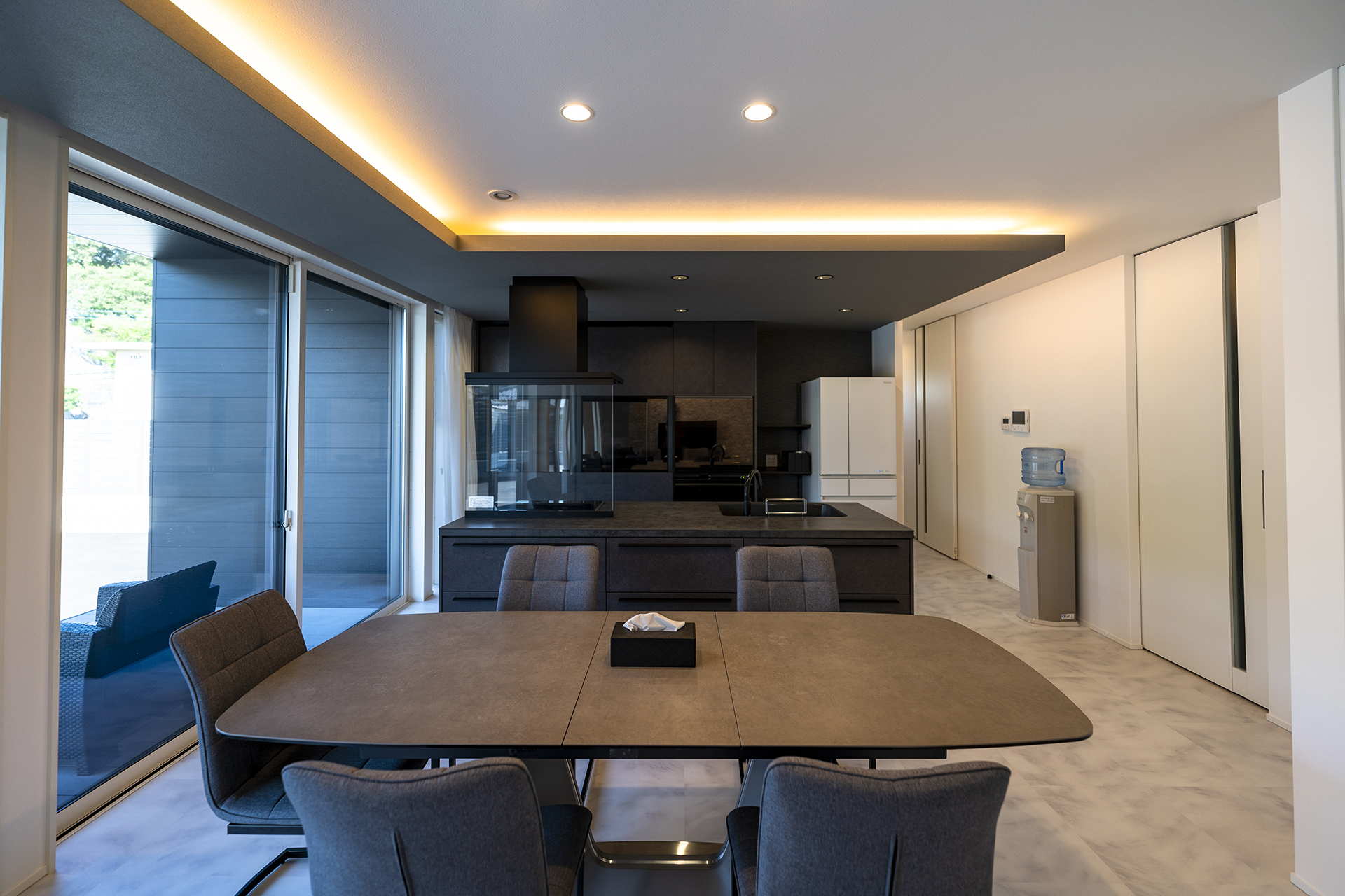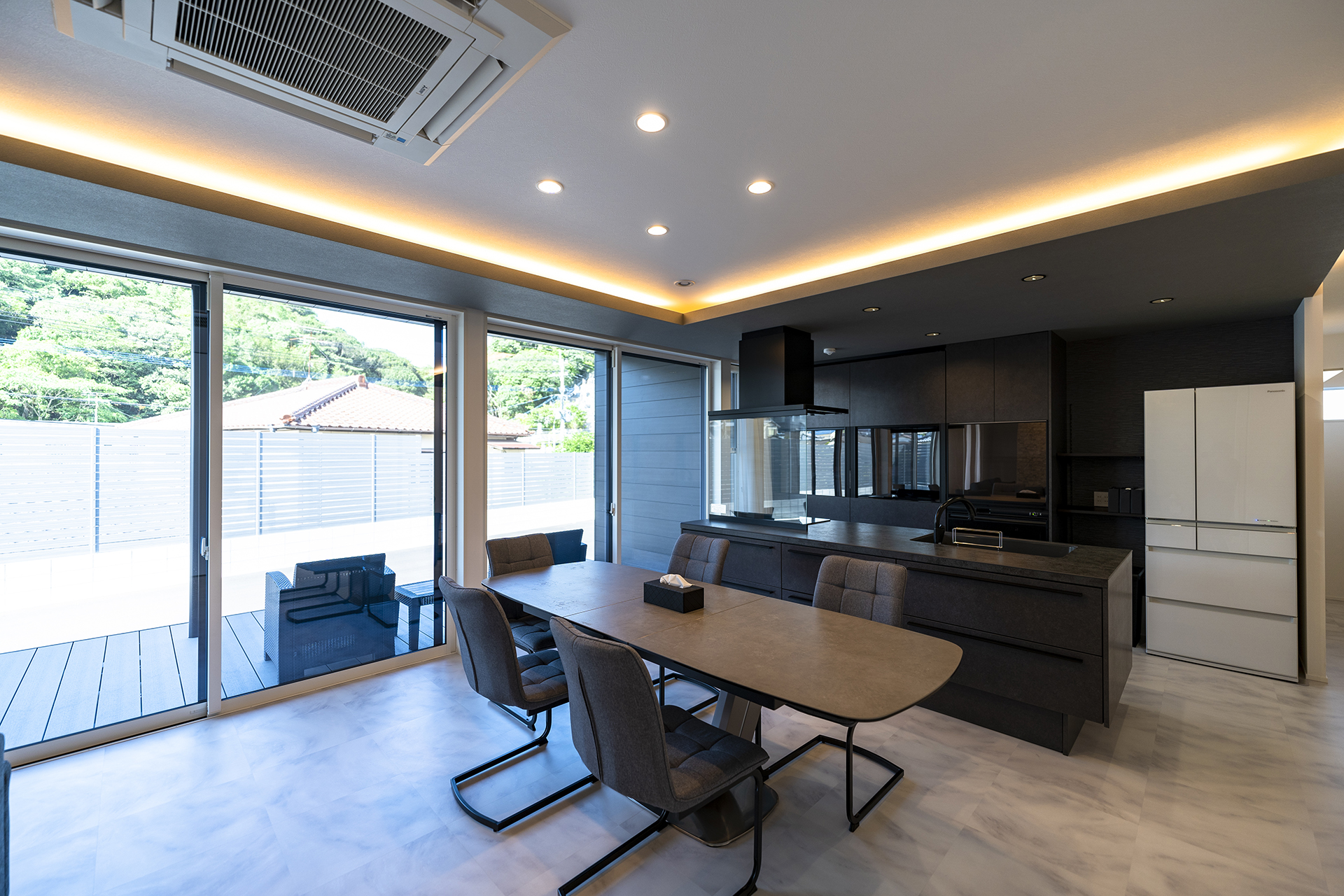広々としたリビングは、白を基調としてダークグレーでしめるシックなモダンスタイルに。幅広の掃き出し窓が、ウッドデッキまでフラットにつながります。天井高まで高さのあるフルハイトドアは、空間をより広く演出してくれます。広々とした空間に目を奪われがちですが、収納力もまた、こだわりのポイントです。エントランスには、ウォークスルー型のシューズクローク。大容量のリビング収納に、家族の衣類を全て収納できるファミリークローゼットを備えています。