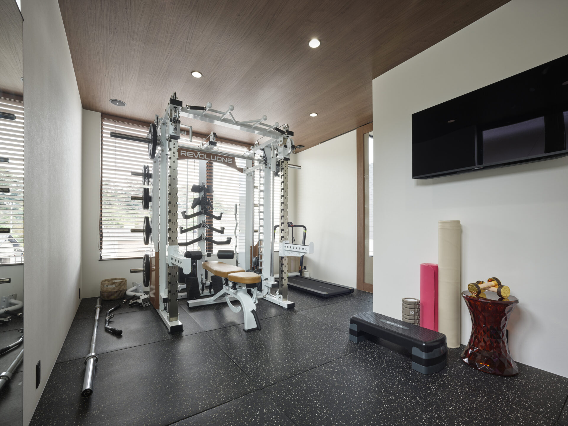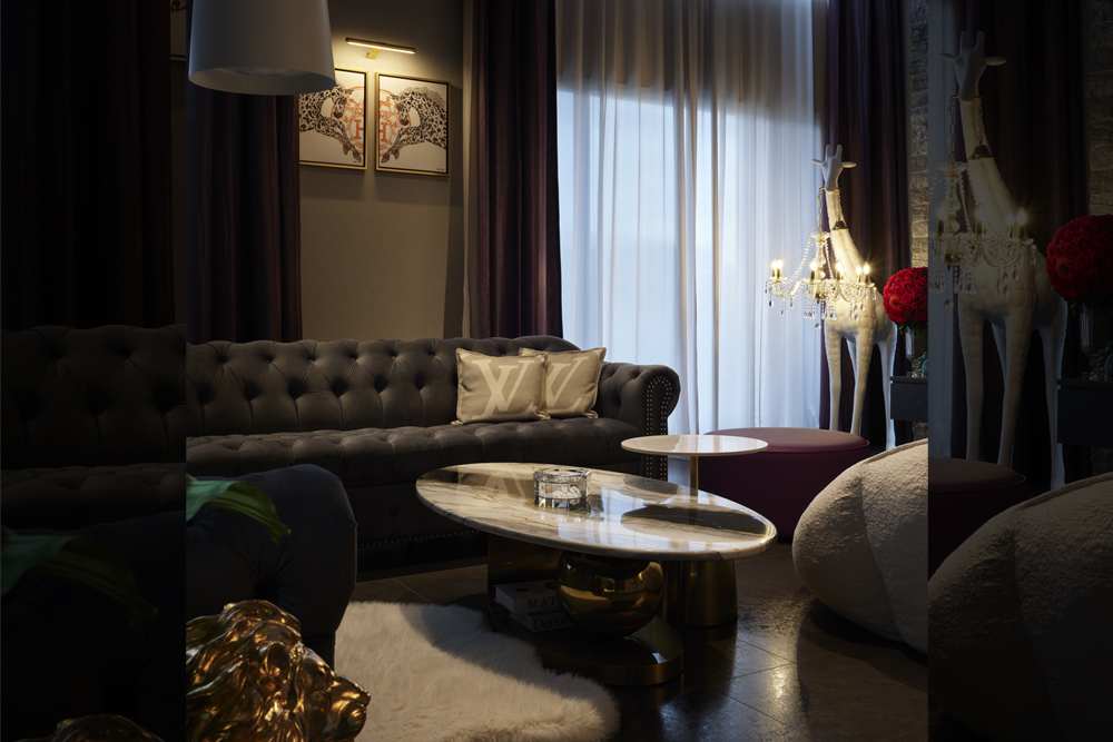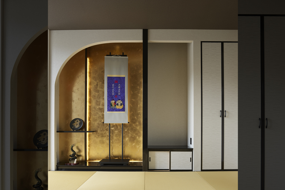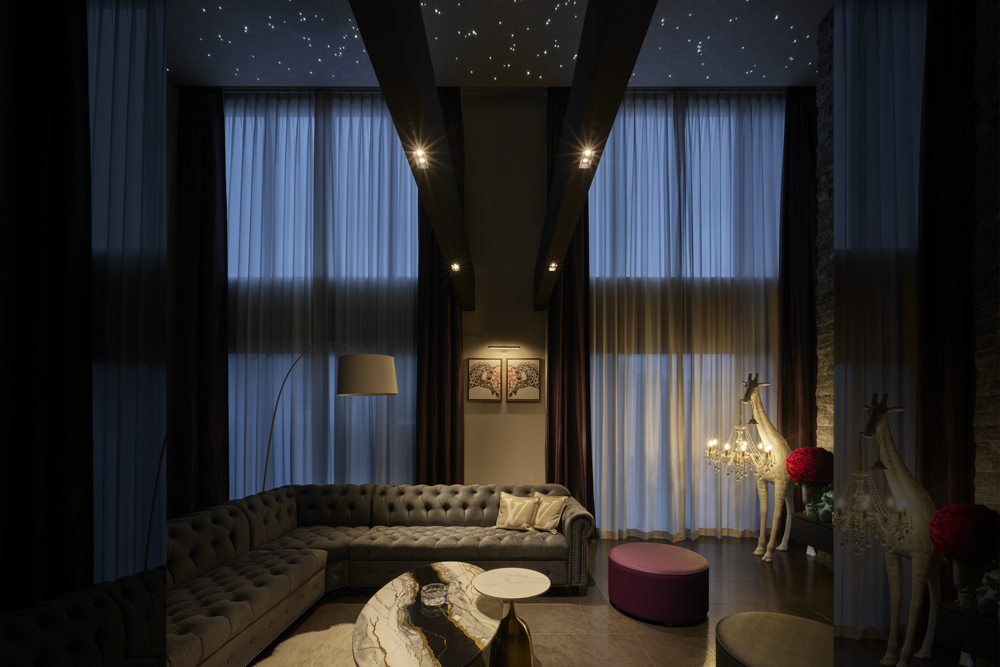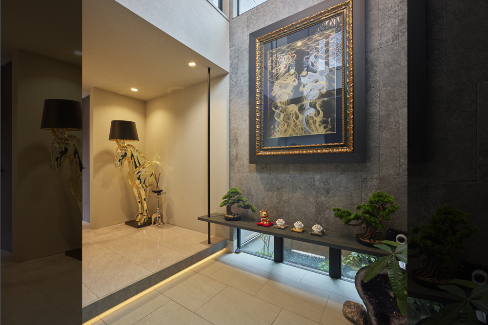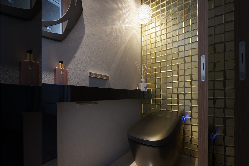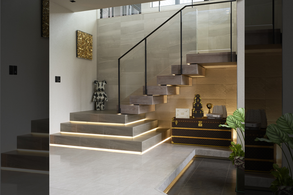 素材が奏でる、ラグジュアリーな大空間の住まい吹抜けを中心に広がる大空間が、ホテルのラウンジのような特別な時間を演出します。石材やタイル、金属など、質感の異なる素材を随所に組み合わせ、ひとつひとつが空間を引き締めるアクセントに。大開口から入る光が表情豊かな素材に反射し、昼夜でまったく違う雰囲気を楽しめるのも魅力です。家具や照明にもこだわり、住まい全体がラグジュアリーな世界観で統一された邸宅となりました。