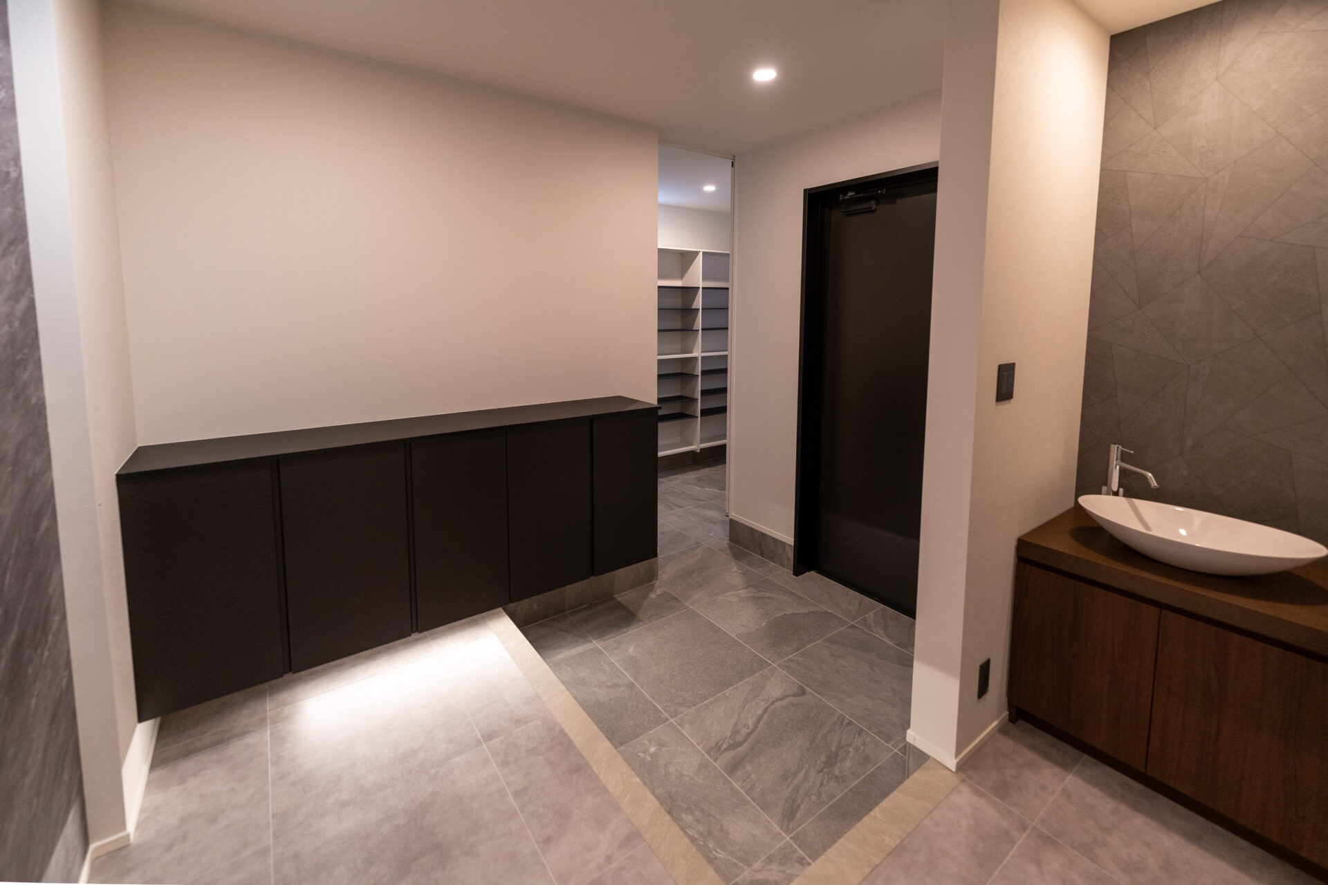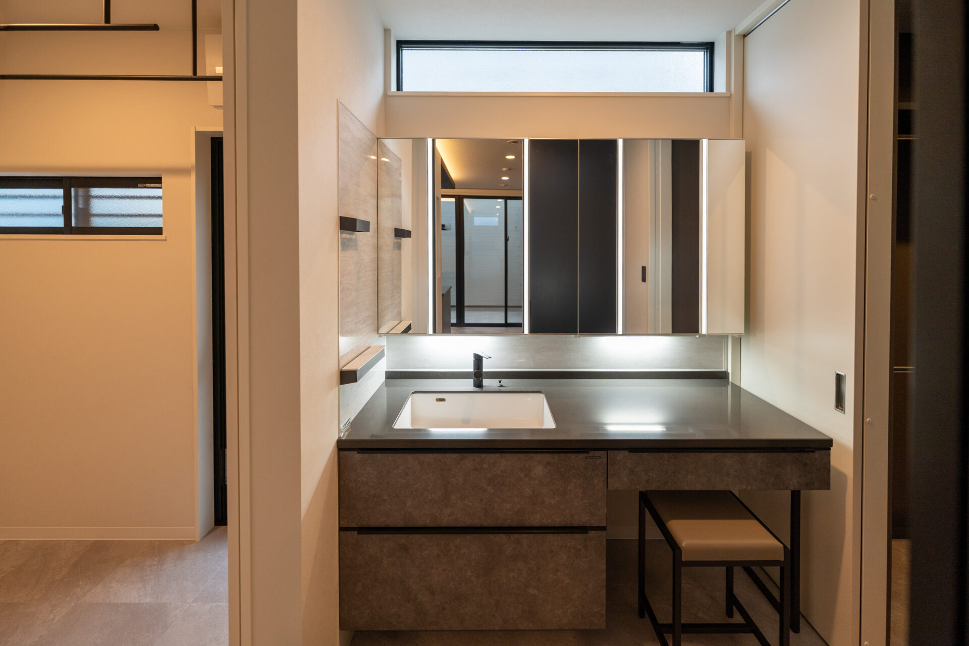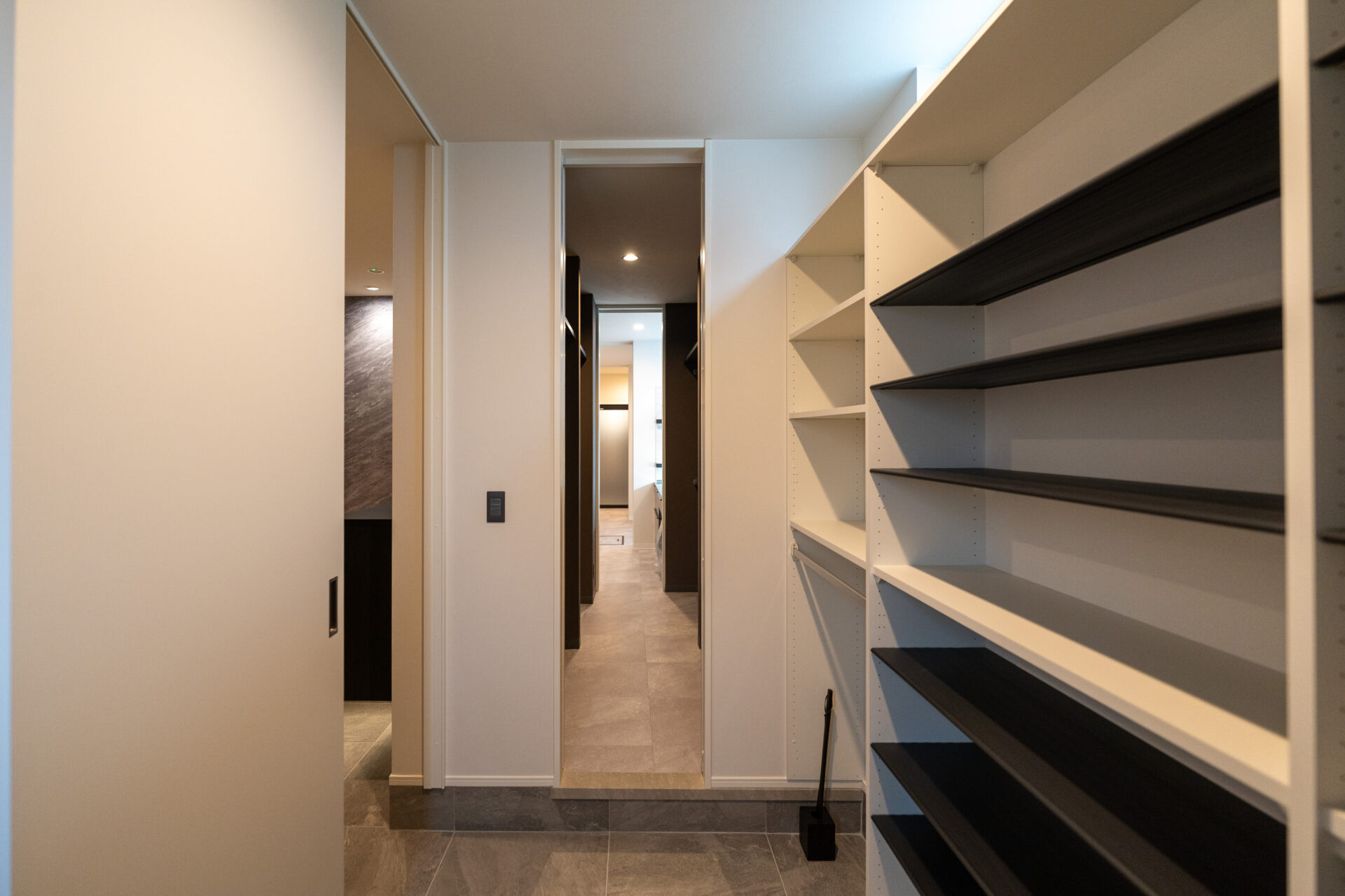 また、生活導線にも細心の注意を払っています。お客様用の玄関とは別に設けられた家族専用の玄関からは、シューズクローク、ファミリークローゼット、洗面所、洗濯室、脱衣所、バスルームへとスムーズにアクセスできるように設計いたしました。この導線は、日常生活の利便性を高めるとともに、生活感をあまりださないような配慮もされています。