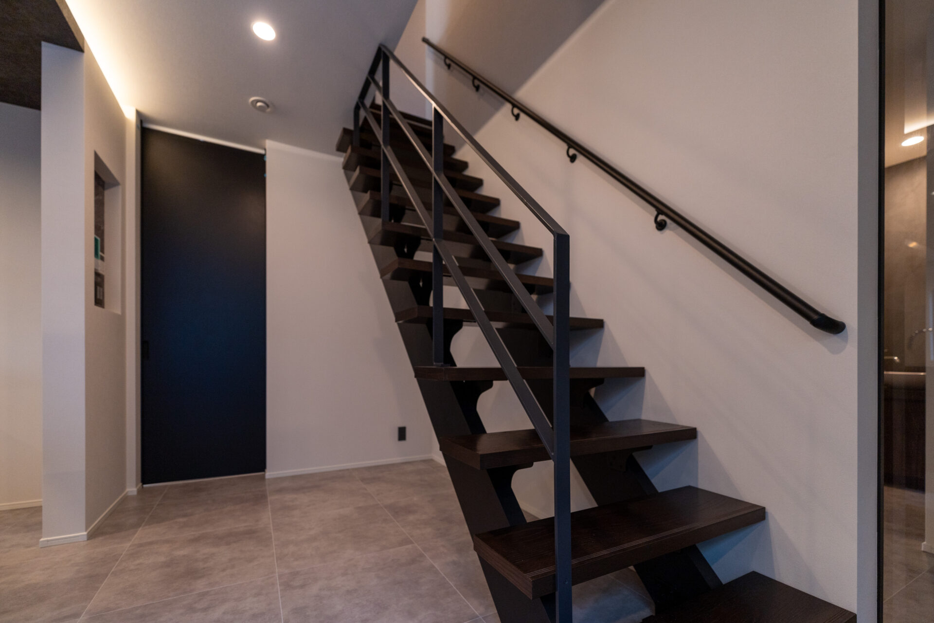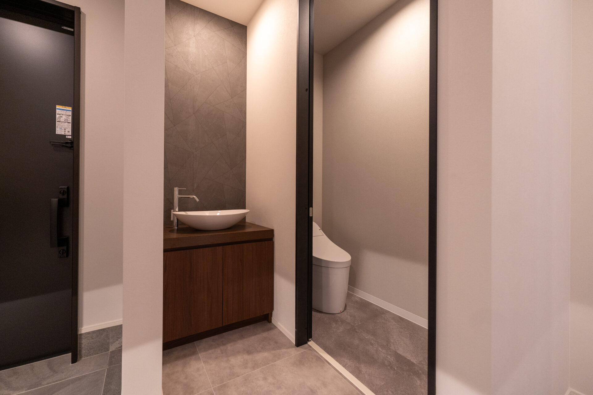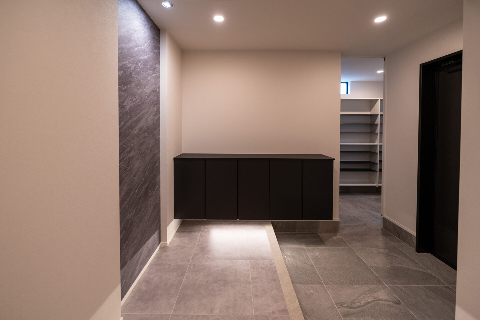 また、生活導線にも細心の注意を払っています。お客様用の玄関とは別に設けられた家族専用の玄関からは、シューズクローク、ファミリークローゼット、洗面所、洗濯室、脱衣所、バスルームへとスムーズにアクセスできるように設計いたしました。この導線は、日常生活の利便性を高めるとともに、生活感をあまりださないような配慮もされています。