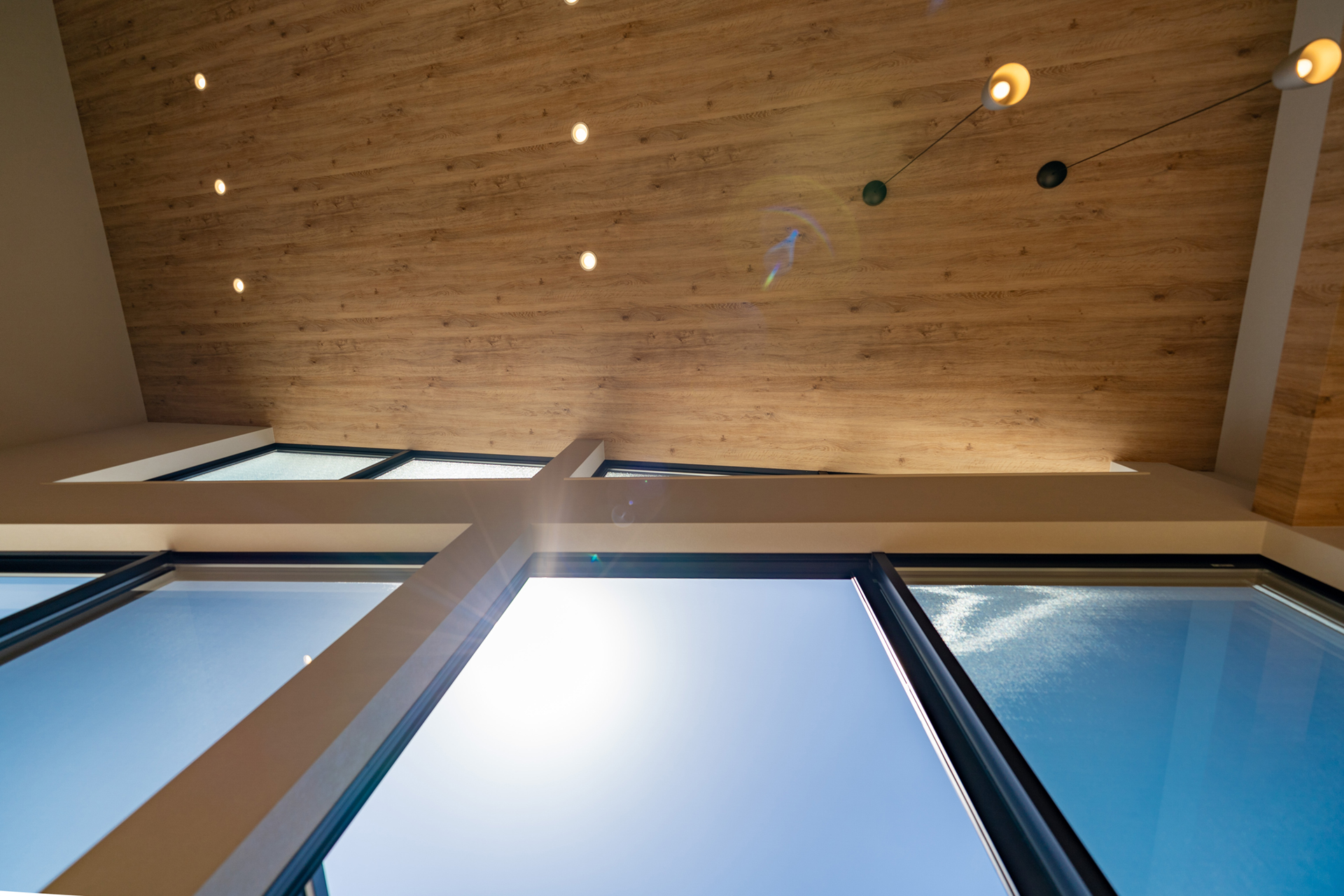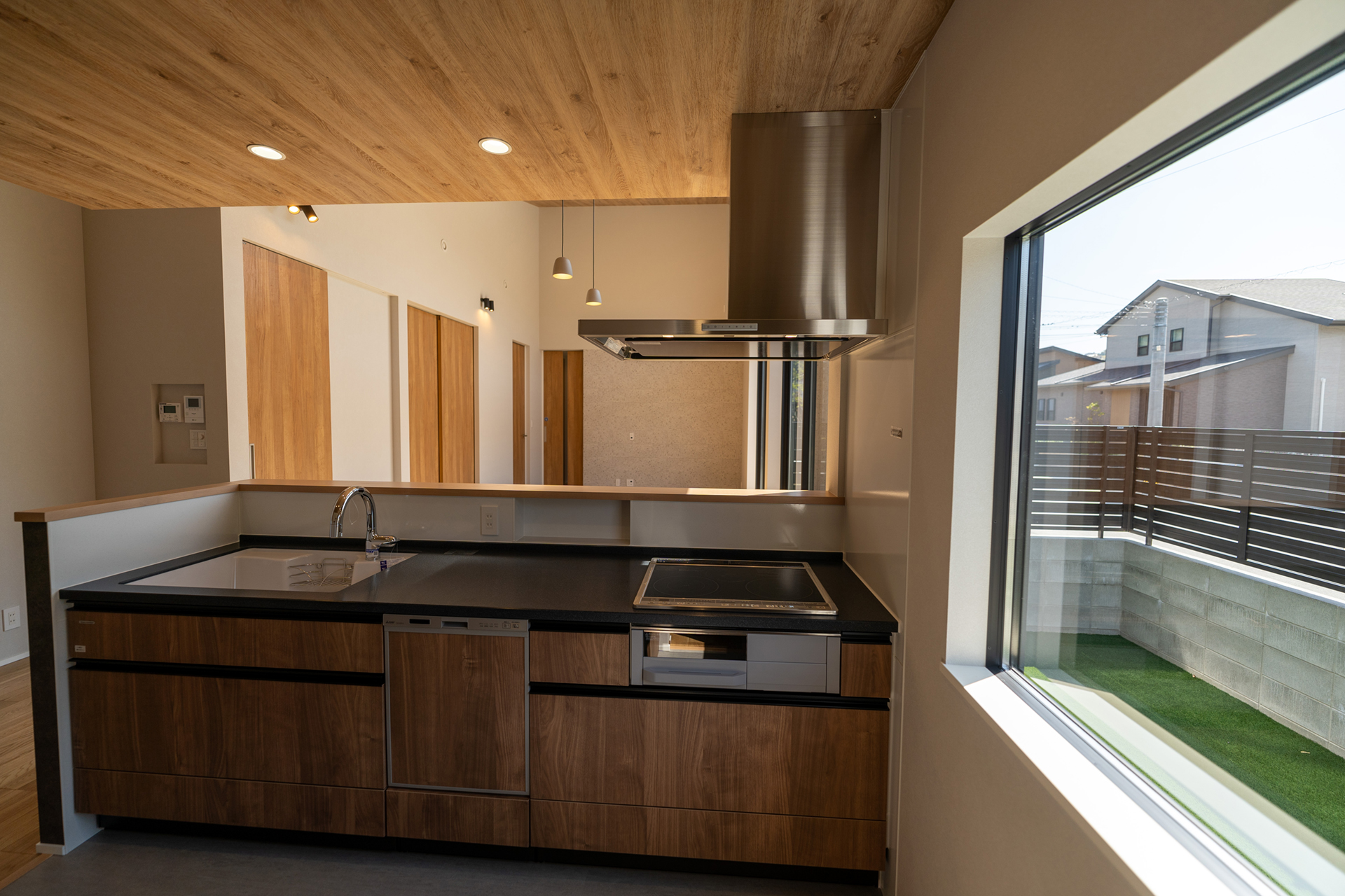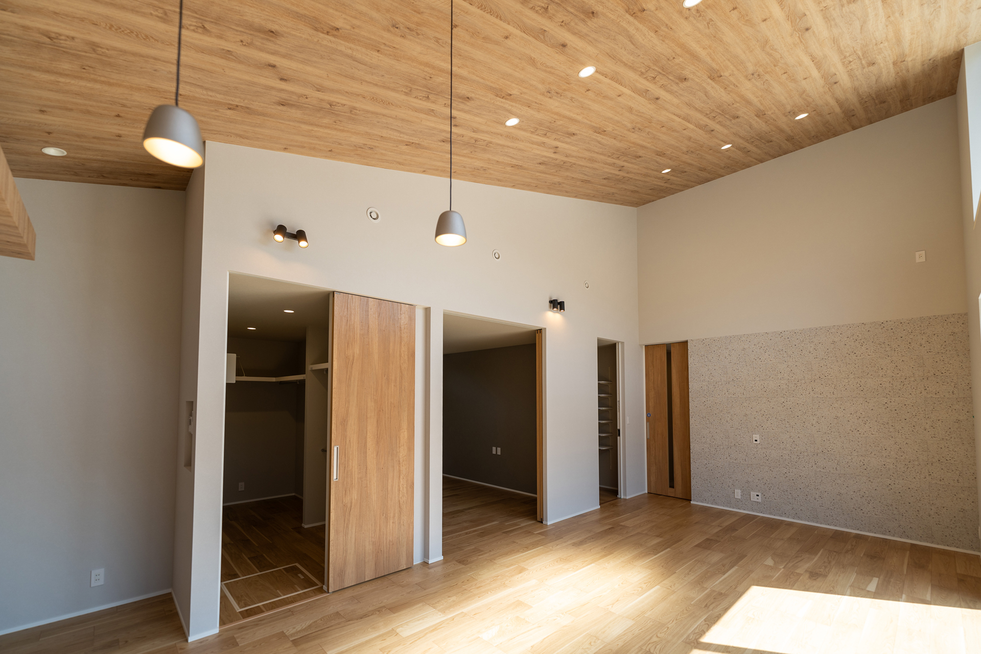 LDKの天井には木目調のクロスを採用しています。通常、広い面積に木目クロスを使用すると圧迫感が生じることがありますが、この住宅では広々とした空間のおかげで、そうした問題を回避。むしろ、この木目調クロスが、住宅の象徴的な要素として際立っています。