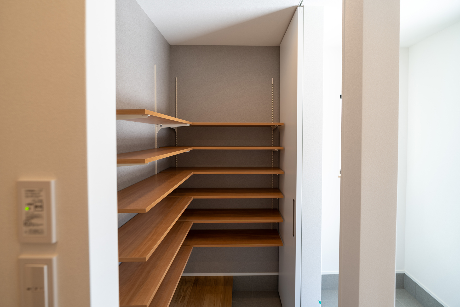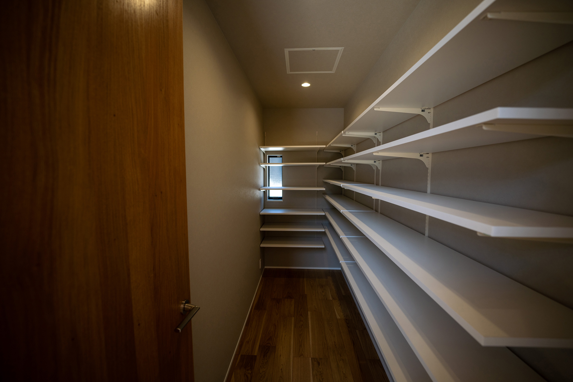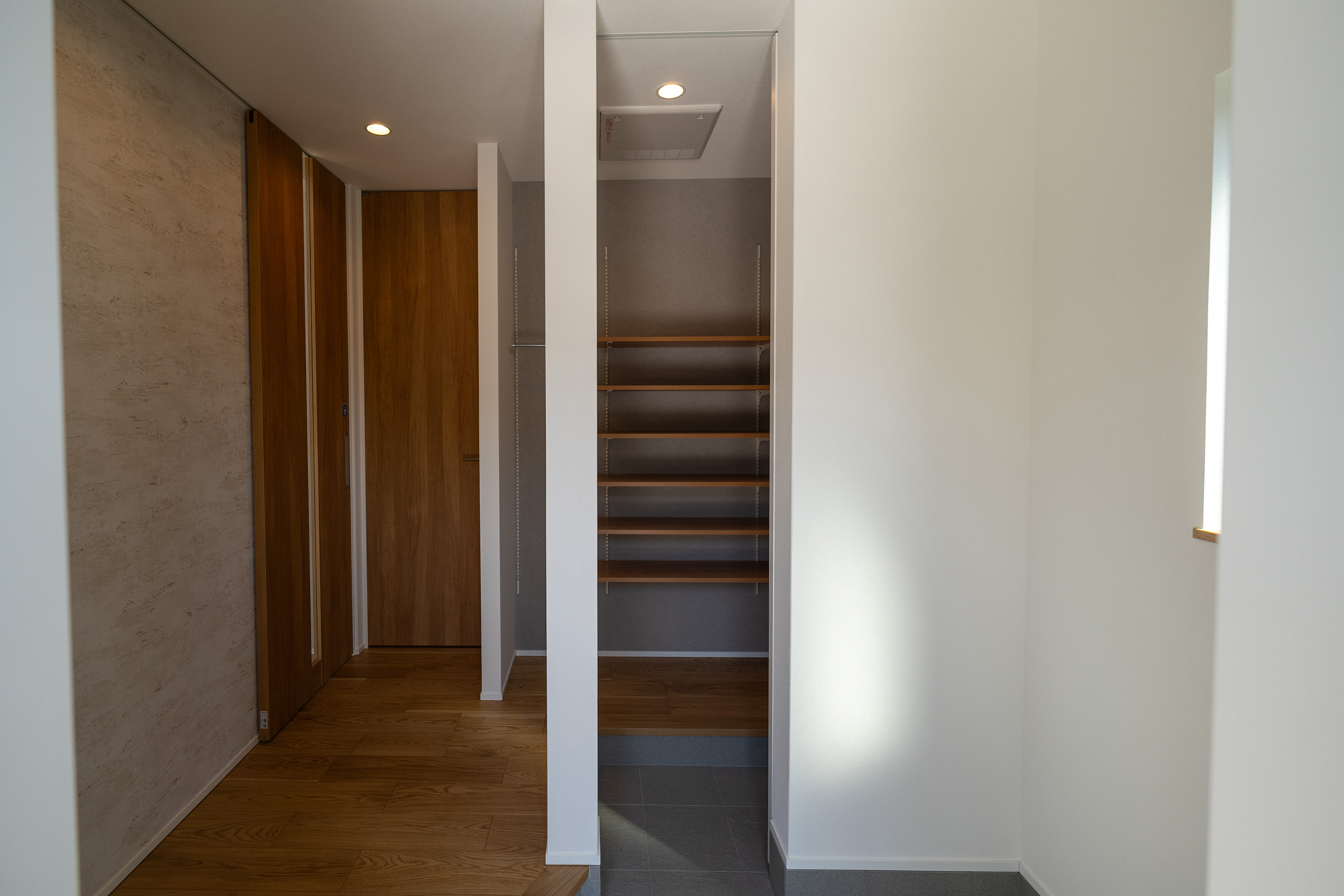 LDKの天井には木目調のクロスを採用しています。通常、広い面積に木目クロスを使用すると圧迫感が生じることがありますが、この住宅では広々とした空間のおかげで、そうした問題を回避。むしろ、この木目調クロスが、住宅の象徴的な要素として際立っています。
