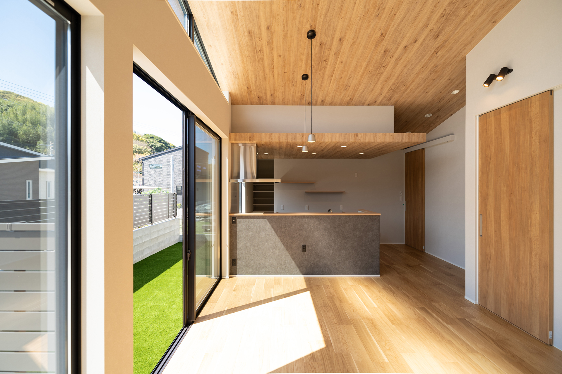 耐震SE構法を取り入れることで、地震、台風に対する安全性にも配慮しながら、開放的な空間を実現しました。南側に設けた天井までの全面窓は、室内を自然光で満たし、明るい雰囲気を演出します。また、Kamiyaのフルハイトドアを採用することで、さらに空間の広がりを感じられる設計となっています。