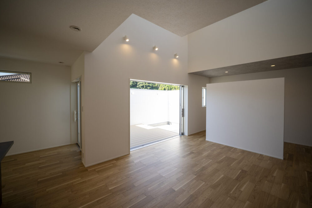圧巻は、四方を壁で囲みプライベートを確保しながらも夜空を楽しむことができるアウトドアリビング。住まうひとだけのために切り取った星空を楽しむことができます。