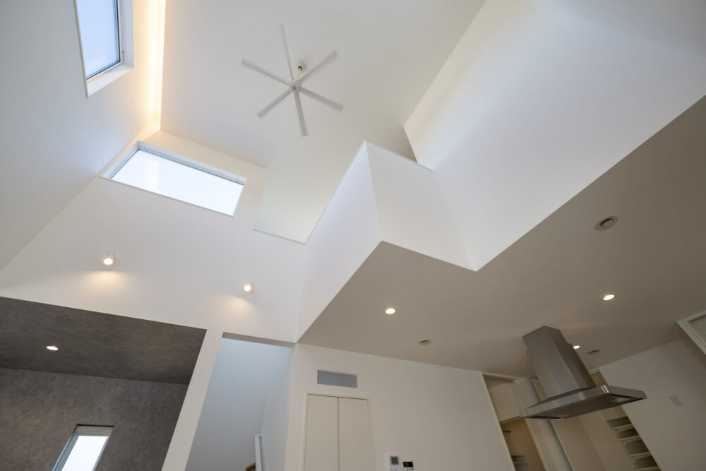 LDKは、耐震SE構法ならではのオーバーバング構造により、柱をたてることなく大空間の吹き抜けと2階ホールを実現しました。