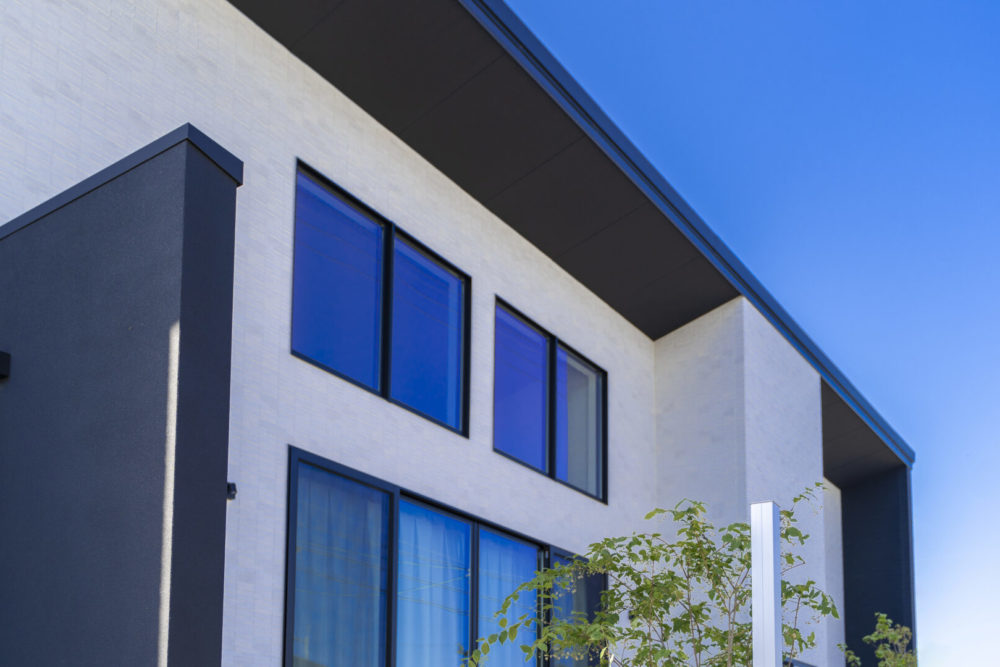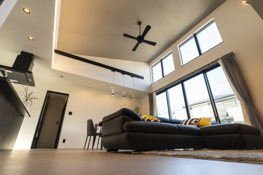 最高天井高4.3m。縦方向にも横方向にも空間が広がる25帖のLDKが圧巻の平屋です。