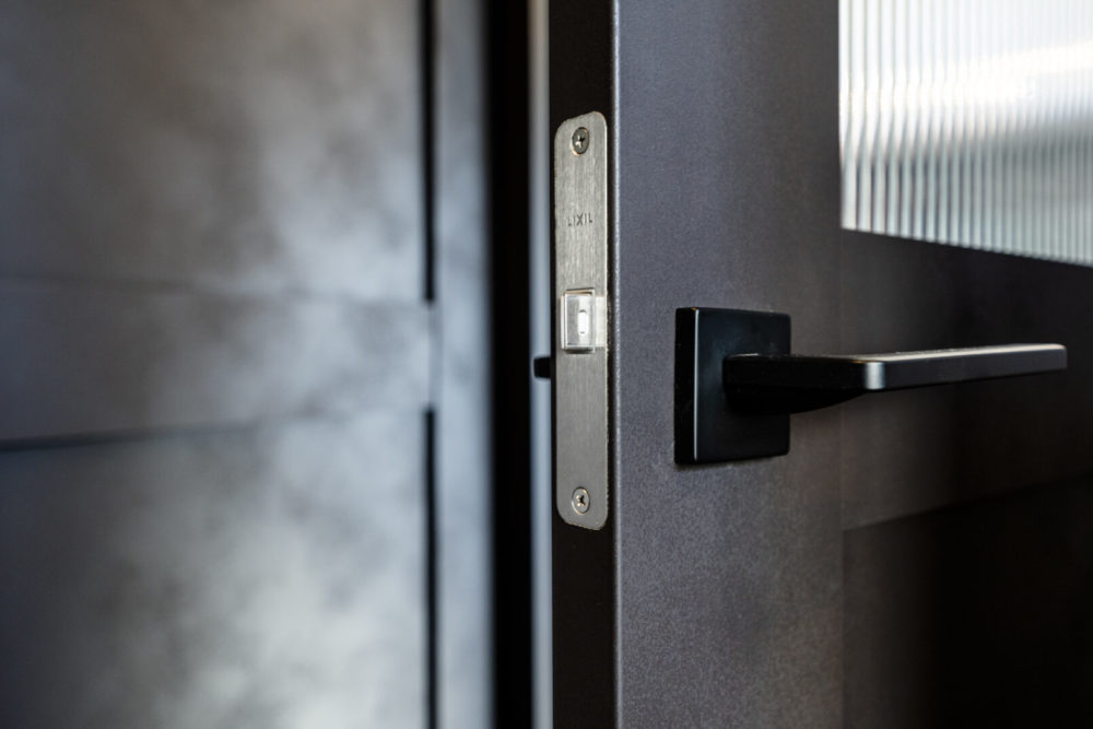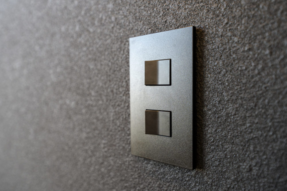 AVボードがある壁面は、マットな質感と柔らかい陰影を生み出すテクスチャをもつジョリパット吹付仕上げでアクセントを。キッチン・アクセントウォールとの統一感を持たせるため室内ドアはLIXILのVINTIA(ヴィンティア)シリーズを採用。マットでざらつきのある質感のスイッチカバーも統一感の演出にひと役かっています。