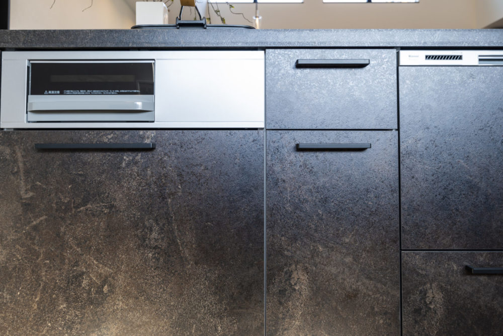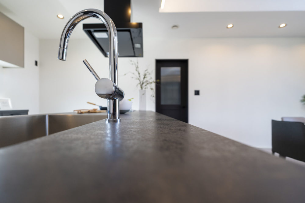 キッチン・キャビネットはセラミックタイルのような深みのある質感が楽しめるGRAFTEKT(グラフテクト)社製アイランドキッチン。キッチン背面のスペースはキャビネットまで約1メートルとご家族が一緒に料理をしても、ゆとりのある設計。