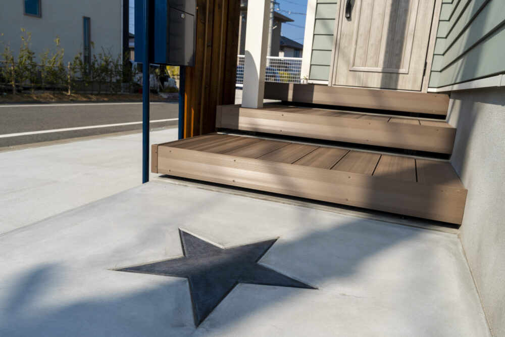 枕木とアイアンの切り文字の門柱が、外観全体に花を添えています。