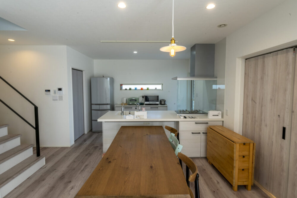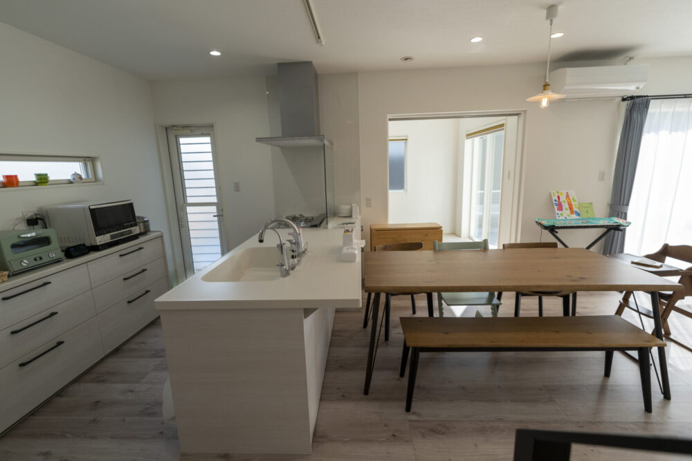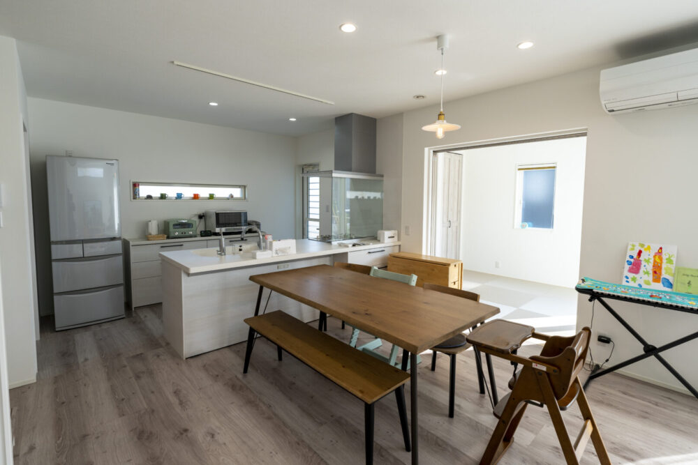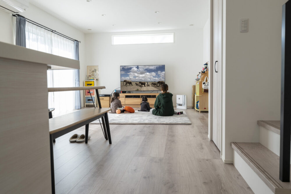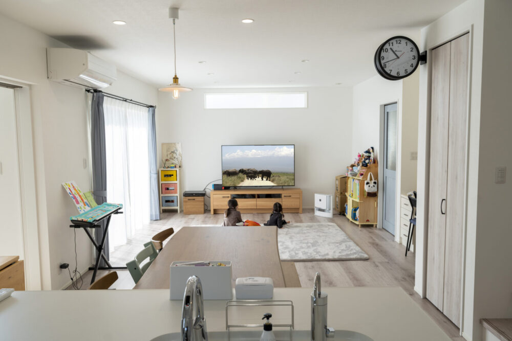 南向きの高窓が明るく照らす広々としたLDKは、キッチンから子供たちが見渡せるシンプル設計。