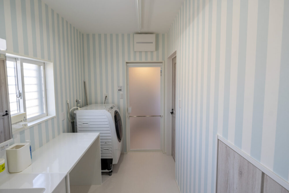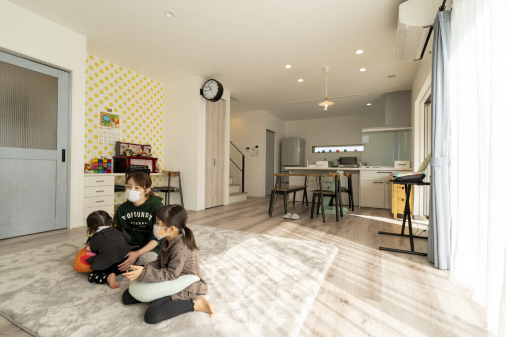 暮らしにリズムをもたらすアクセントクロスや、あえて色違いで変化をつけた建具など随所にこだわりと遊び心を取り入れた1邸となりました。