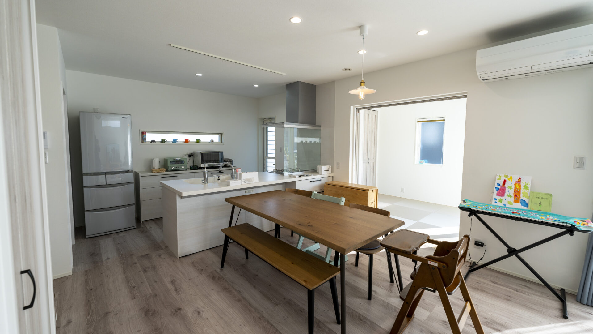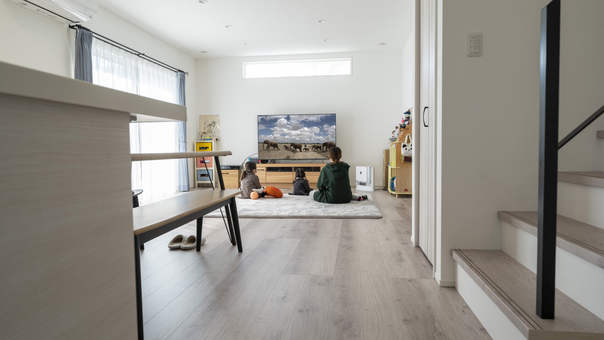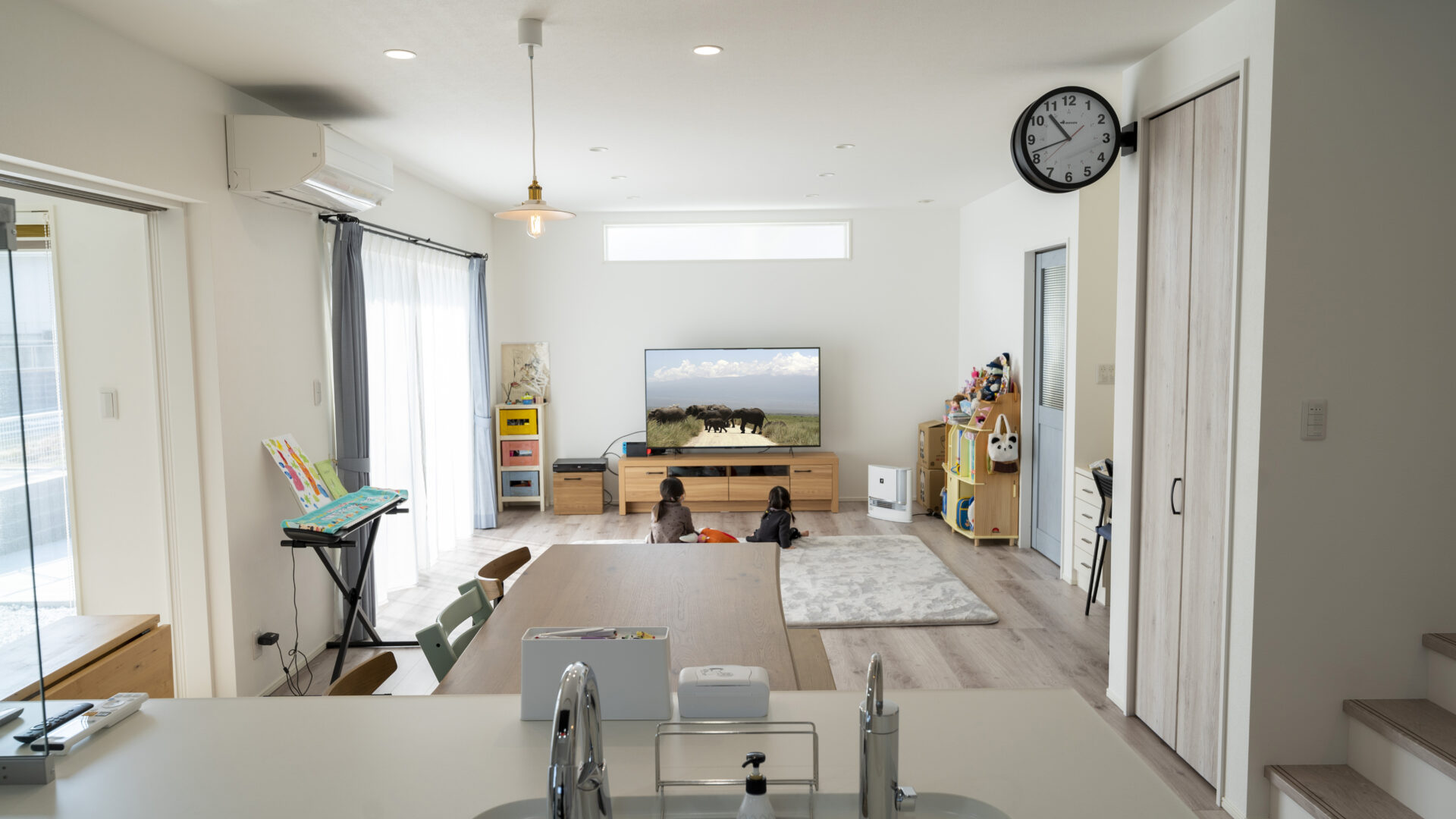 南向きの高窓が明るく照らす広々としたLDKは、キッチンから子供たちが見渡せるシンプル設計。