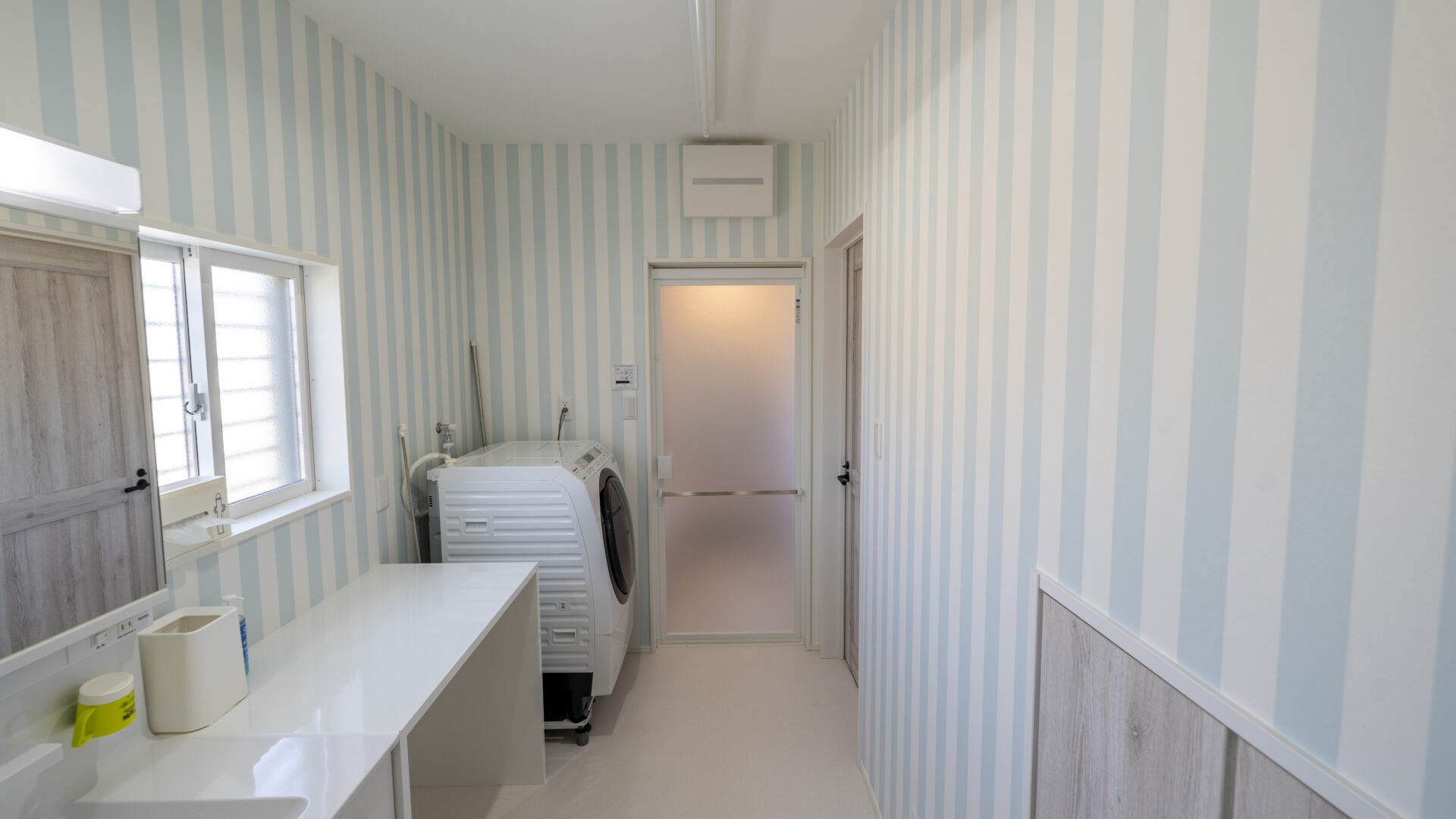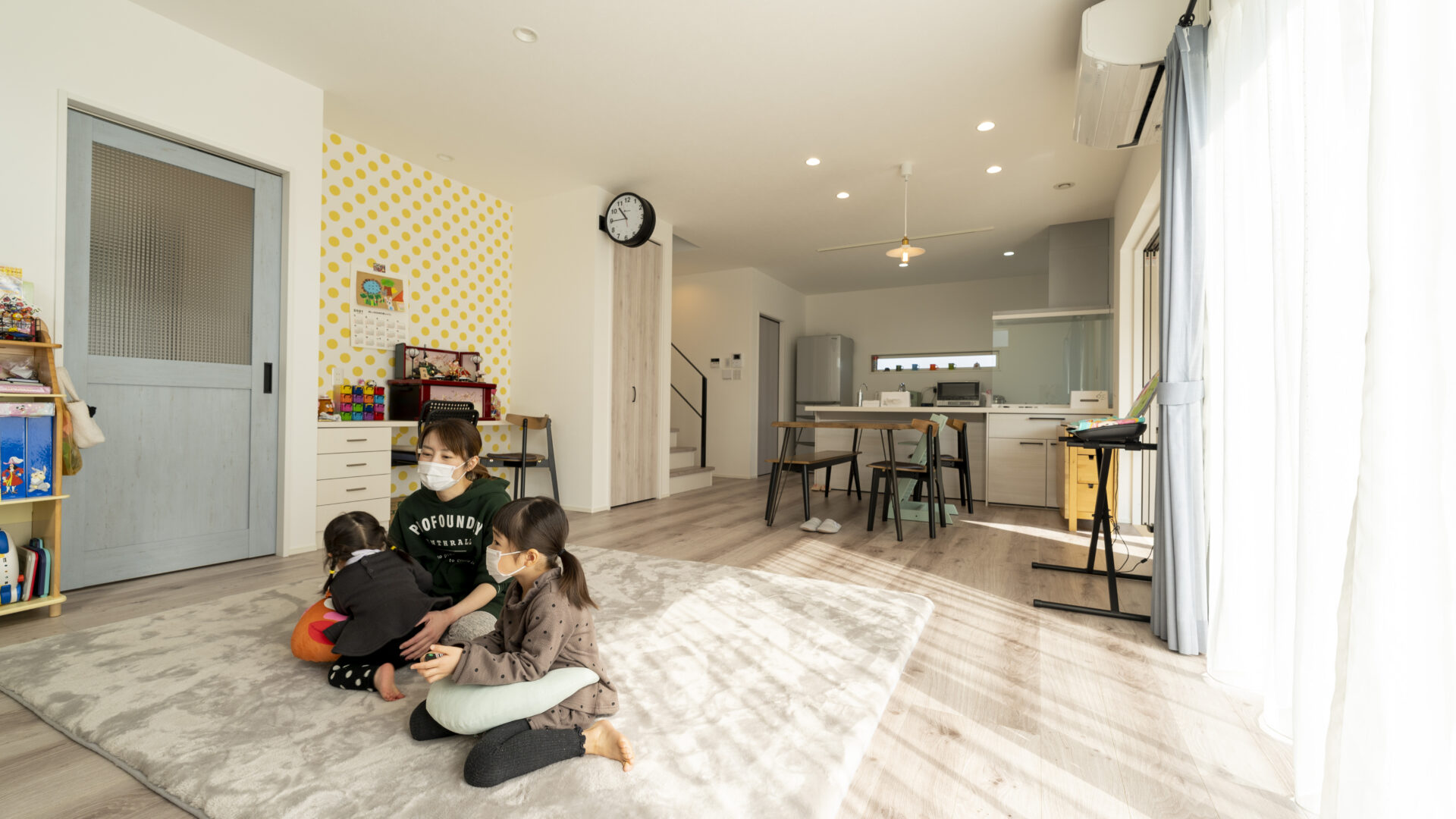 暮らしにリズムをもたらすアクセントクロスや、あえて色違いで変化をつけた建具など随所にこだわりと遊び心を取り入れた1邸となりました。